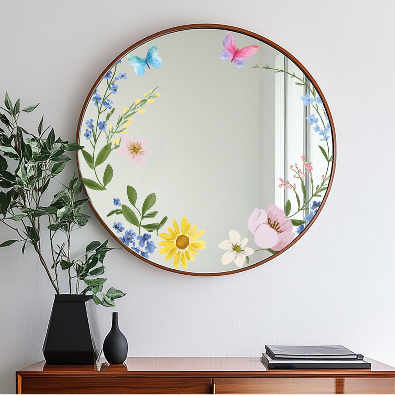 Hermosas calcomanías de espejo de flores y mariposas, calcomanías florales extraíbles, calcomanías de pared para despegar y pegar,