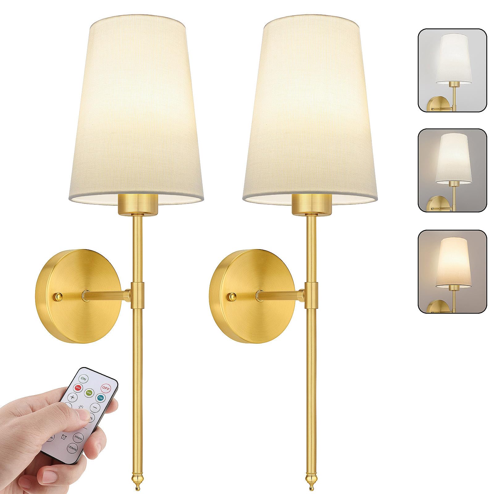 Juego de 2 apliques de pared a pilas, lámpara de pared recargable con control remoto, 3 colores regulables, juego de 2, lámpara de