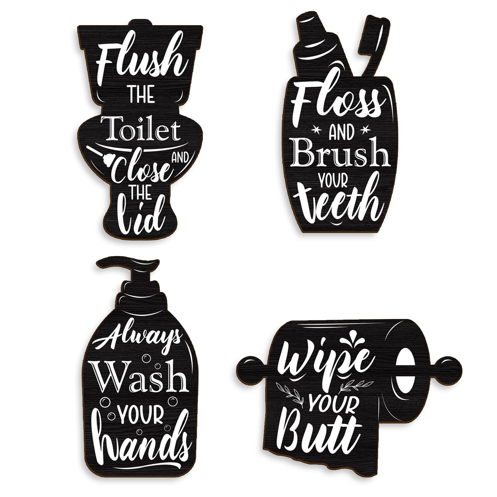 Letreros decorativos de pared para baño, placas de madera en blanco y negro, divertido diseño de cepillo de lavado, juego de 4