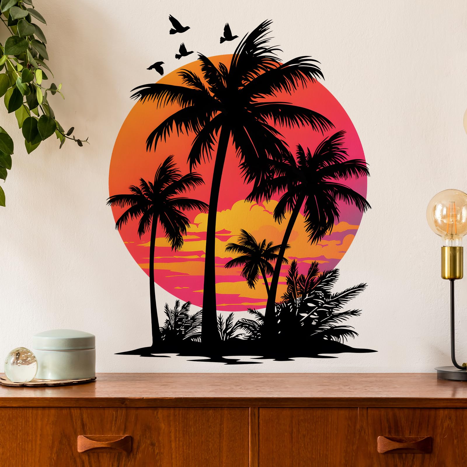 Calcomanías de pared con palmeras y pájaros tropicales para sala de estar, silueta de plantas, calcomanías de pared extraíbles par