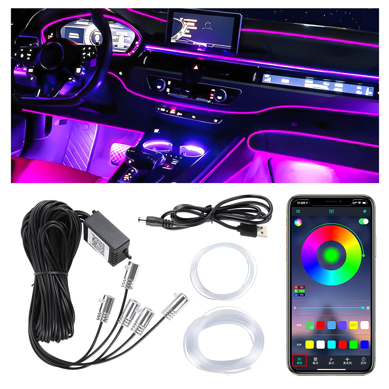 Tira de luces LED para interiores de automóvil con control inalámbrico de aplicación, kit de iluminación ambiental 5 en 1 con fibr