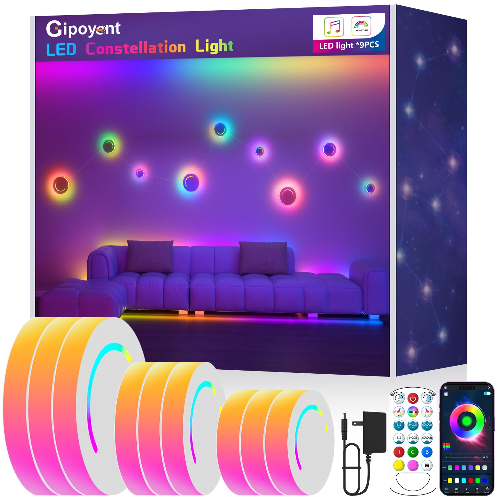 GIPOYENT Luz de pared inteligente, 9 piezas, luz LED de constelación, cambio de color RGB, sincronización de música, aplicación y