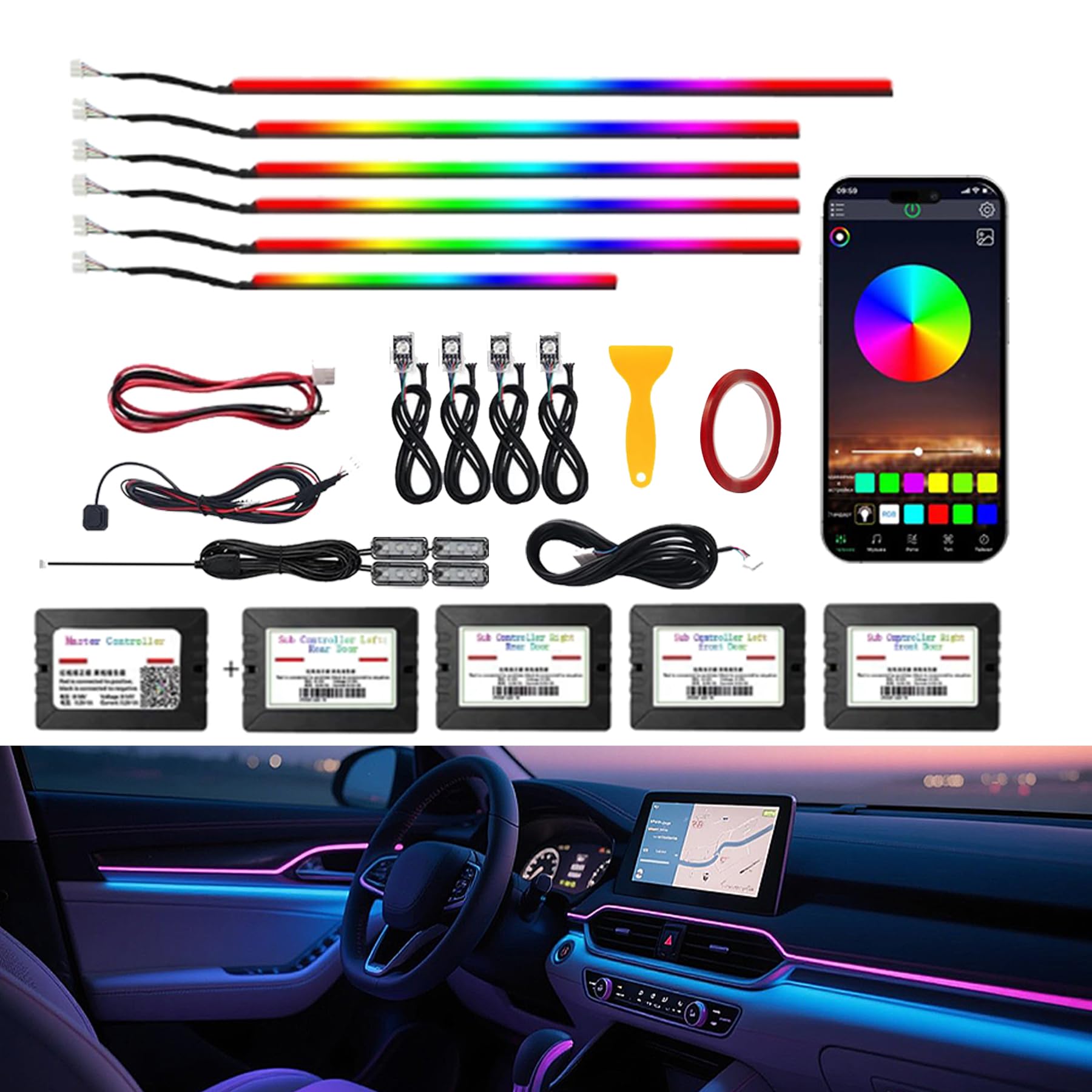 Tira de luz LED RGB 14 en 1 para interior de automóvil con aplicación inalámbrica, 16 millones de luces interiores de automóvil, i