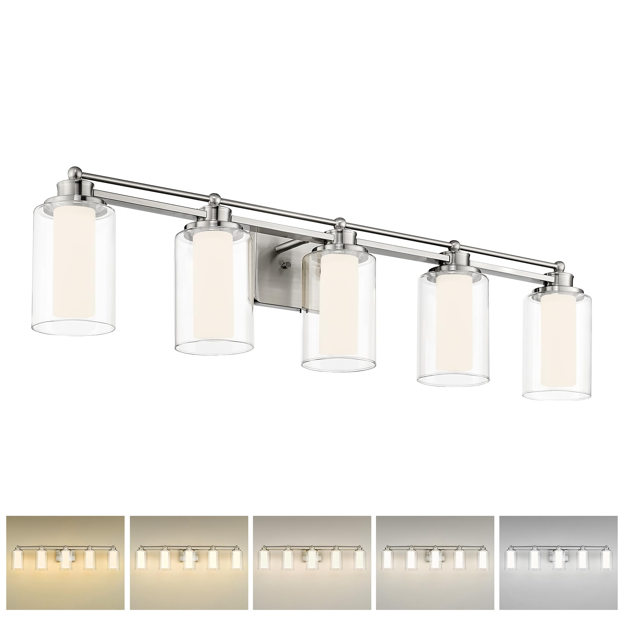 HWH 5HLT63B-5W-LED BN – Lámpara de tocador de 5 luces, montaje en pared de níquel cepillado sobre espejo, 30 W 5CCT regulable LED
