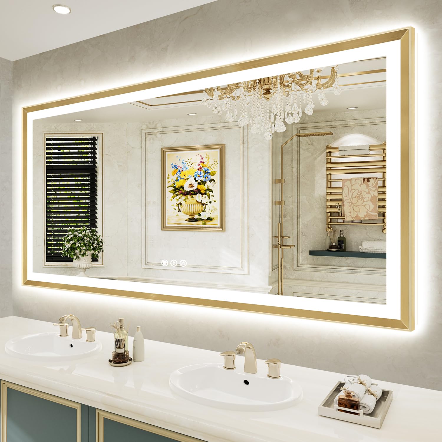 Espejo de baño LED con marco dorado de 72 x 36 pulgadas con luces, retroiluminación y luz delantera, espejo de tocador de baño ilu