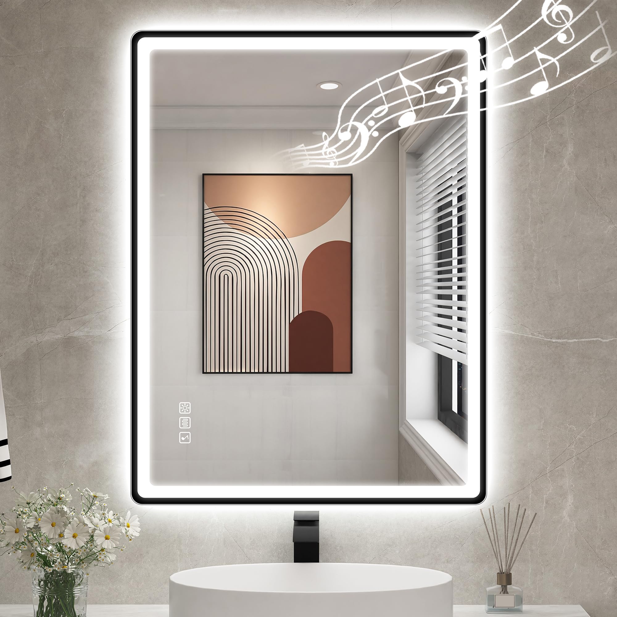 Espejo LED de baño con luces LED de 28 x 36 pulgadas, montado en la pared con Bluetooth, antivaho, brillo regulable de temperatura