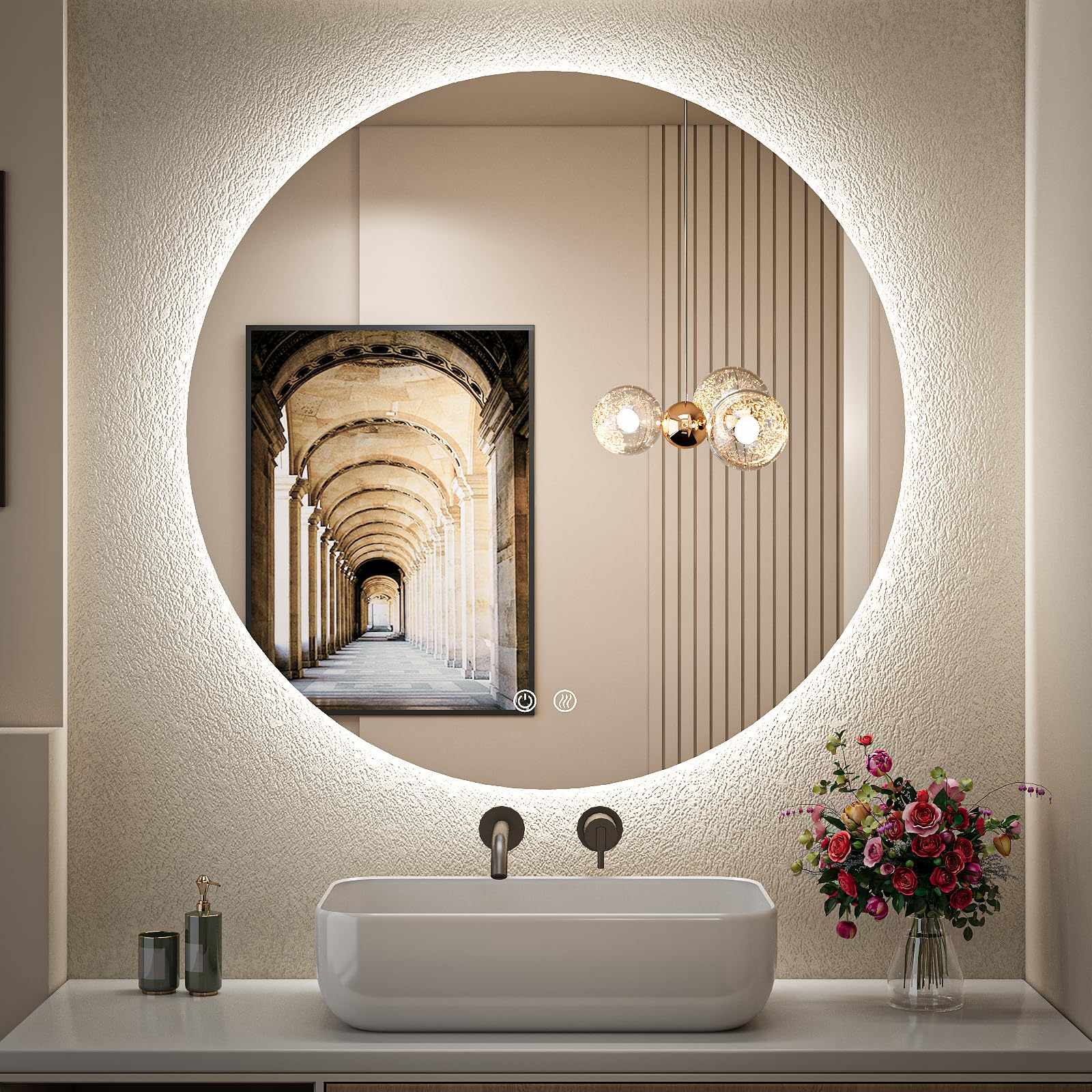 Espejo redondo retroiluminado LED de 32 pulgadas para tocador, espejo de pared regulable para baño, 6000 K, con luces, antiniebla,