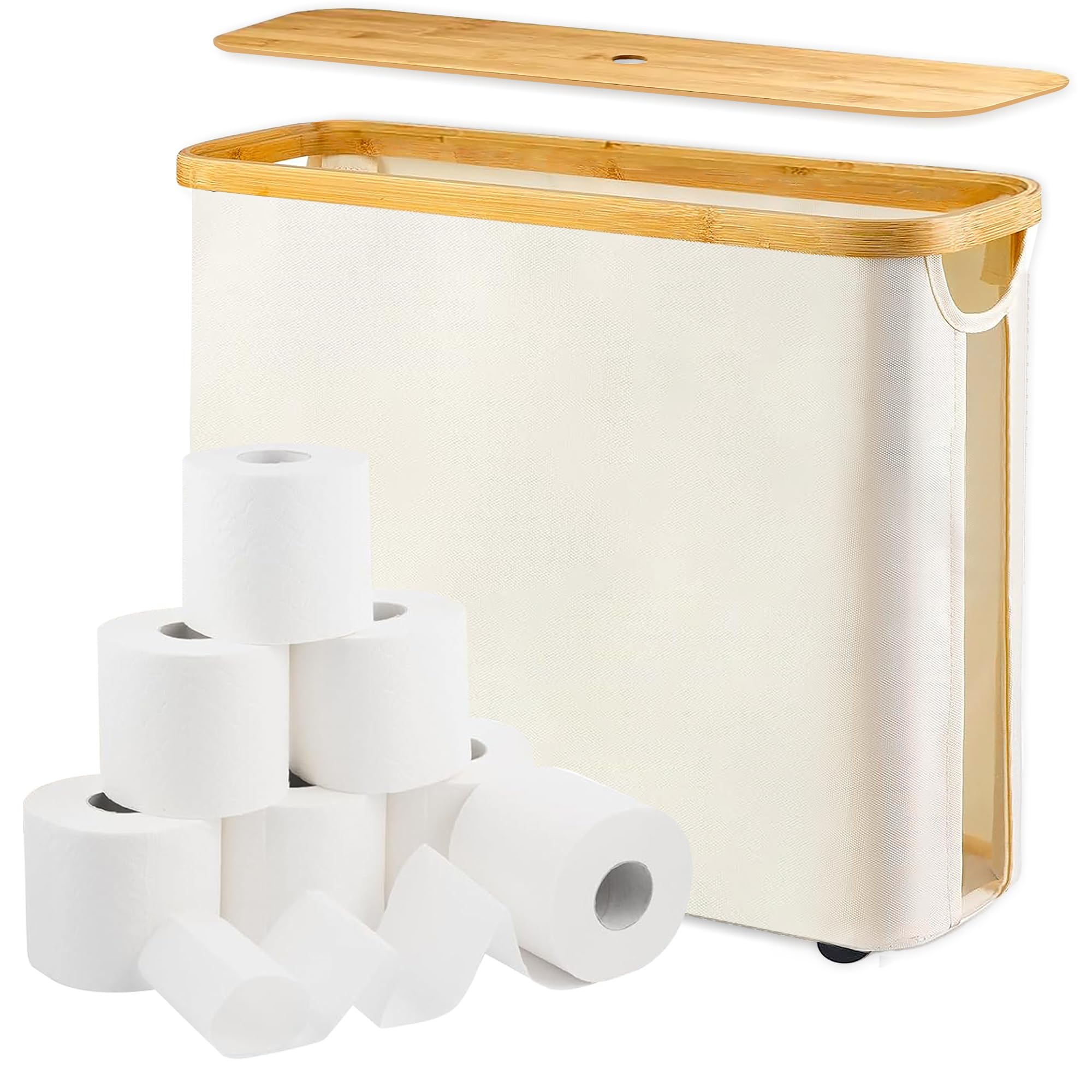 Cesta de papel higiénico de 30 L, almacenamiento moderno de papel higiénico con tapa y asa de bambú, organizador para 12 rollos, c