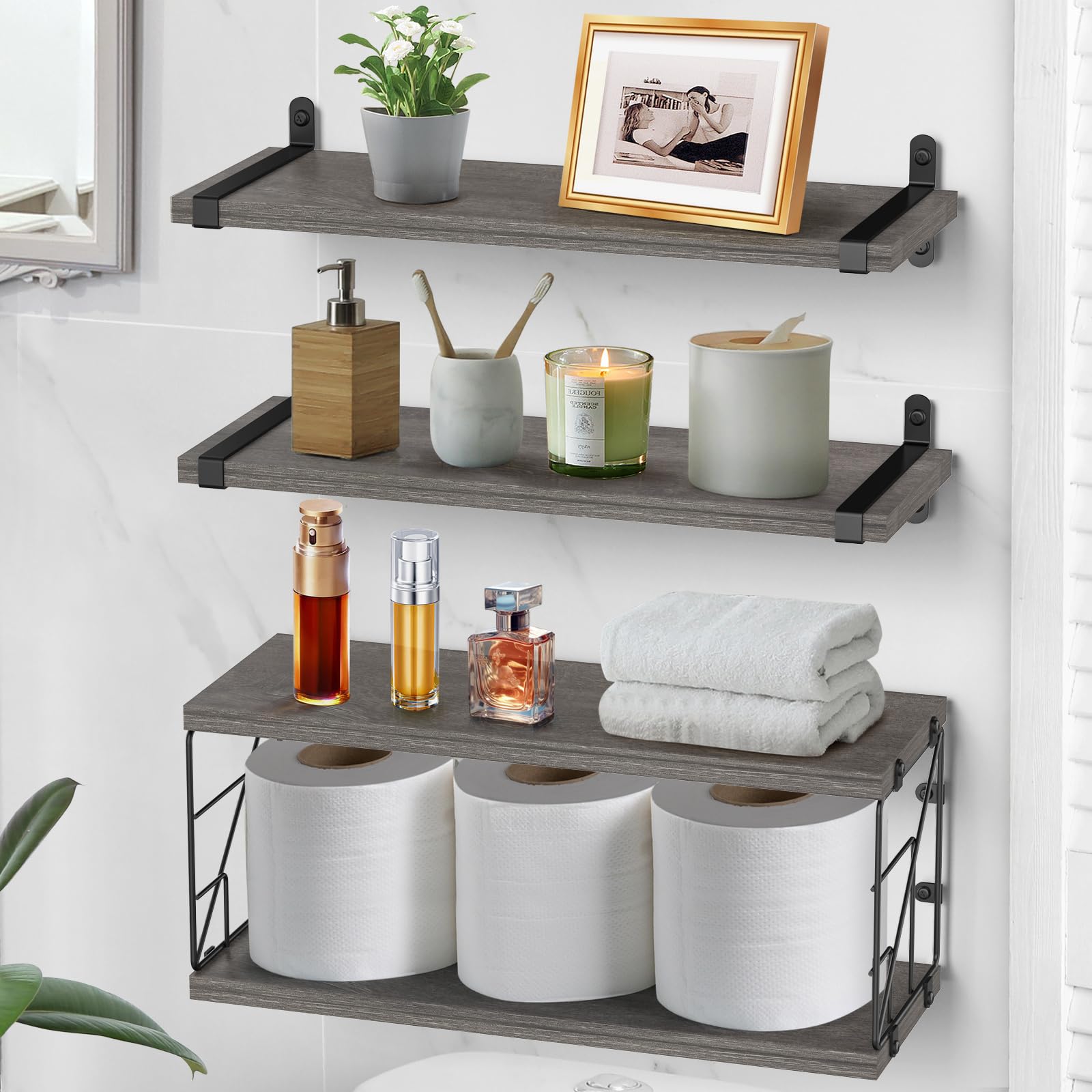 Fixwal Estantes de baño montados en la pared de 3+1 nivel sobre el inodoro, estantes flotantes de madera rústica con marco de meta