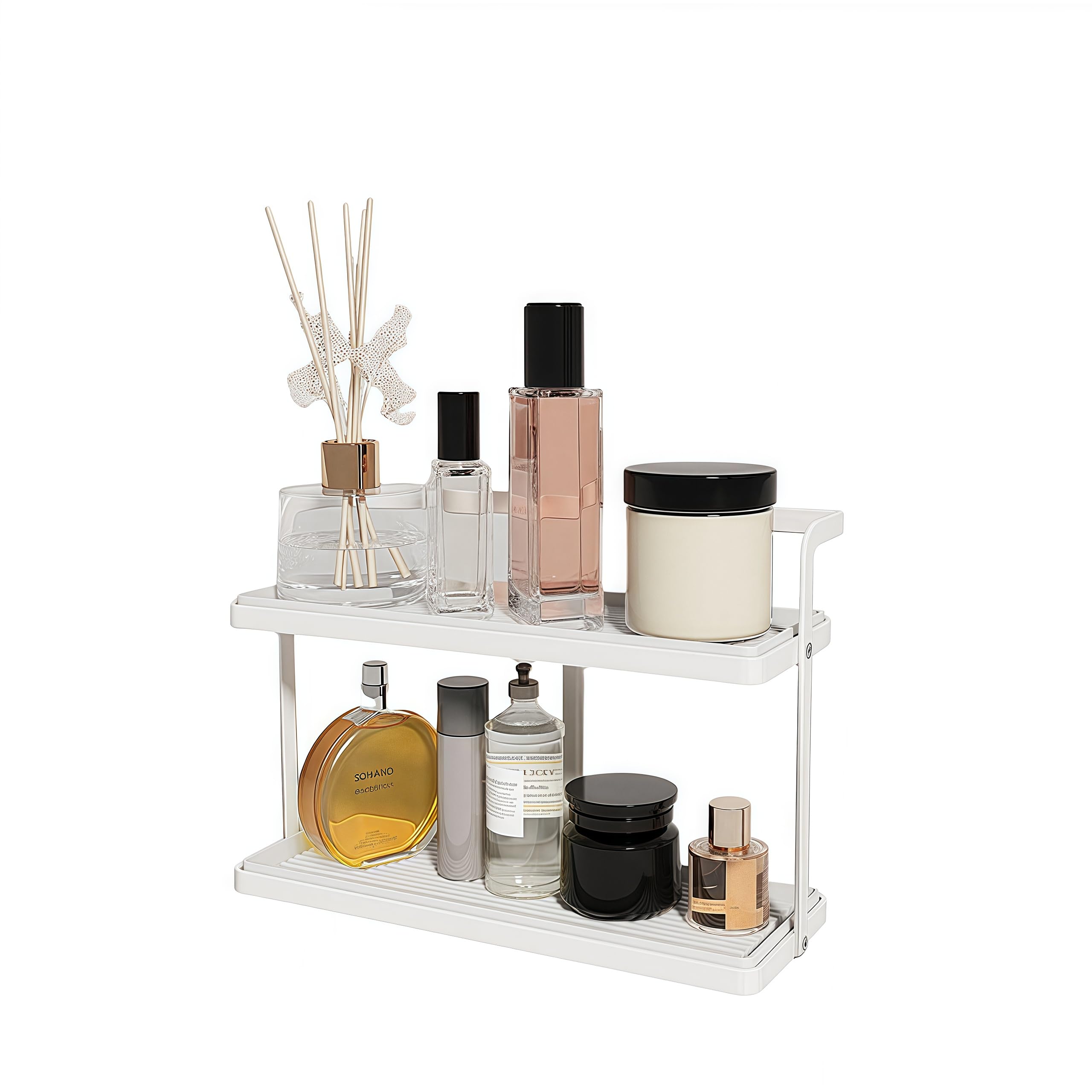 Organizador de encimera de baño para espacios pequeños, estante de maquillaje de 2 niveles con bandeja de tocador, instalación sin
