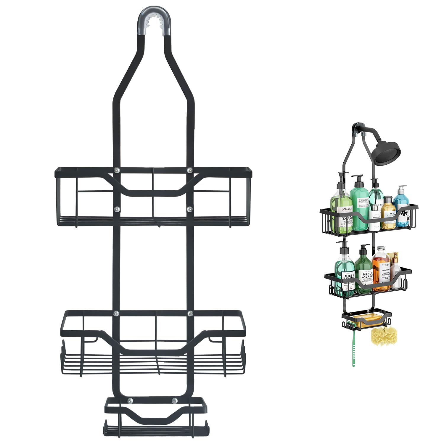 SWTYMIKI Organizador colgante de ducha – Organizador de ducha sobre la puerta con jabonera, se puede colgar en el grifo o pie de g