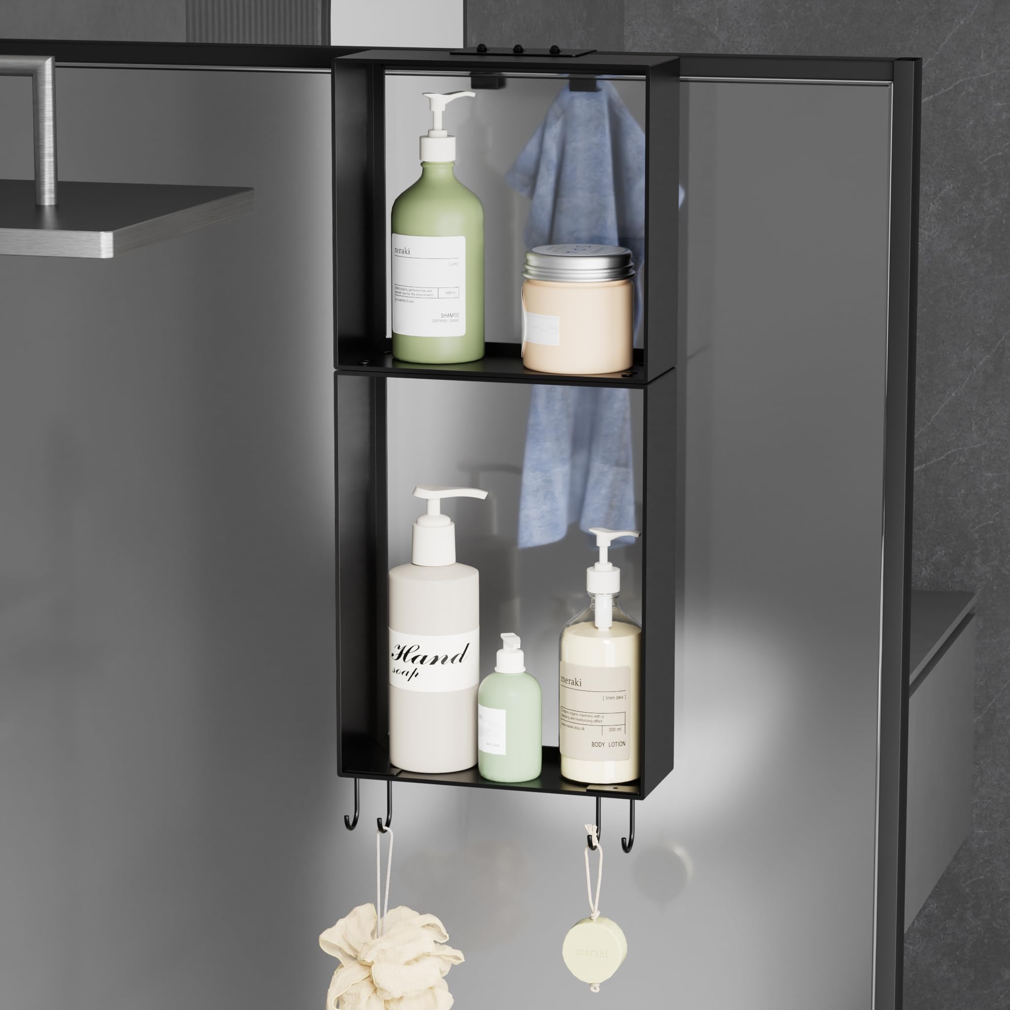 Organizador de ducha sin taladrar sobre el vidrio, acero inoxidable negro resistente al óxido, se adapta a cabina de ducha/puerta