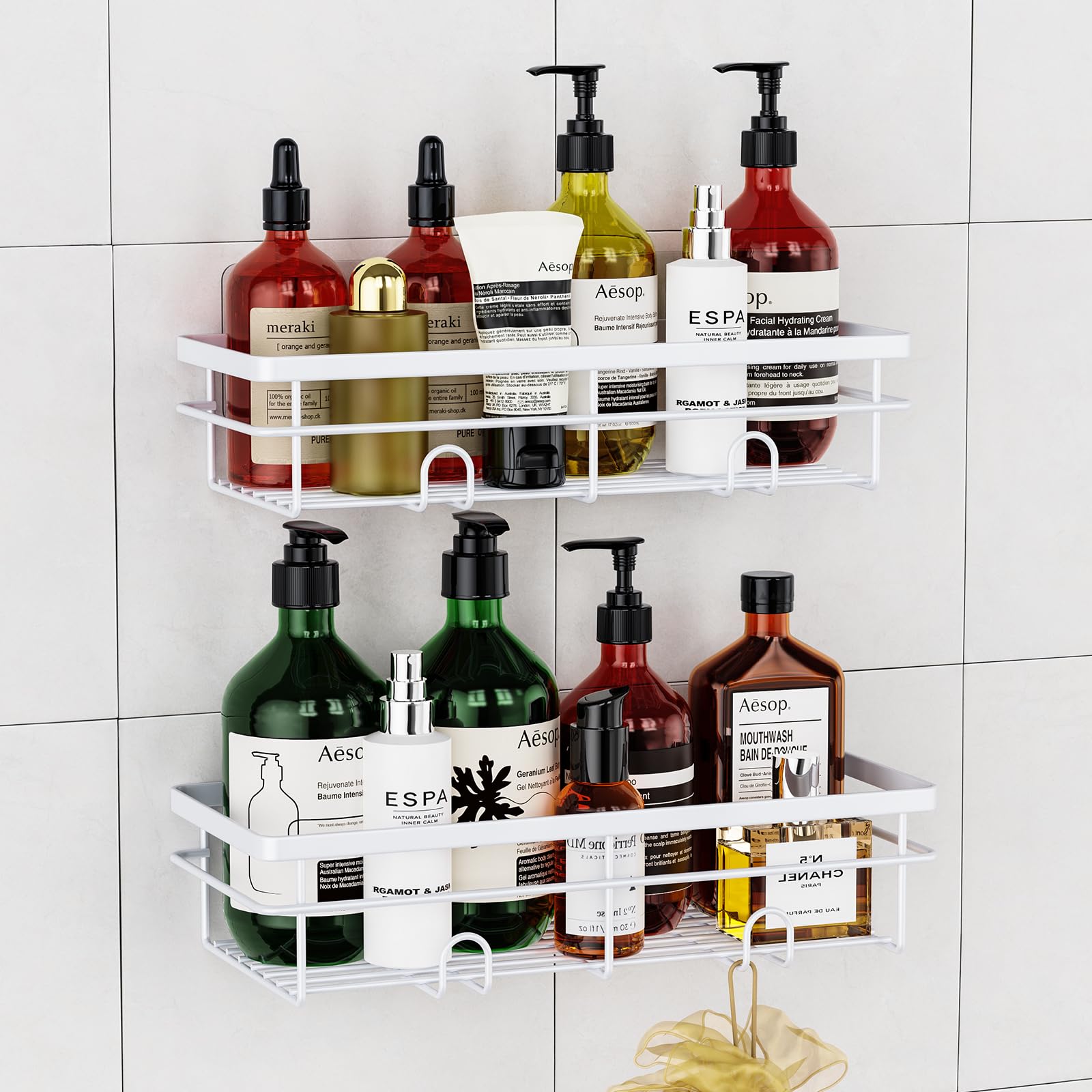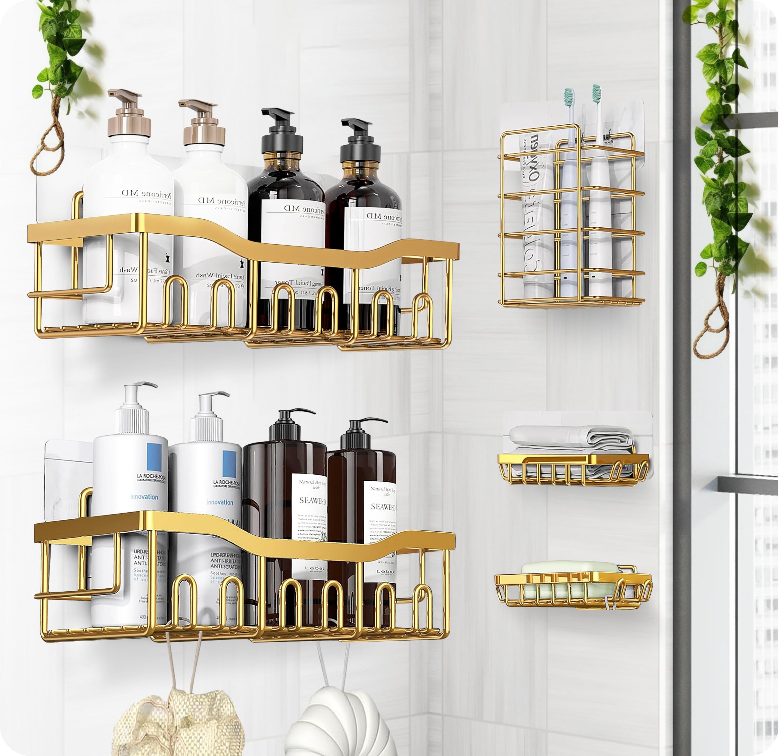 Juego de 5 organizadores de ducha adhesivos de acero inoxidable de estilo lujoso, organizador de baño a prueba de óxido con gran c