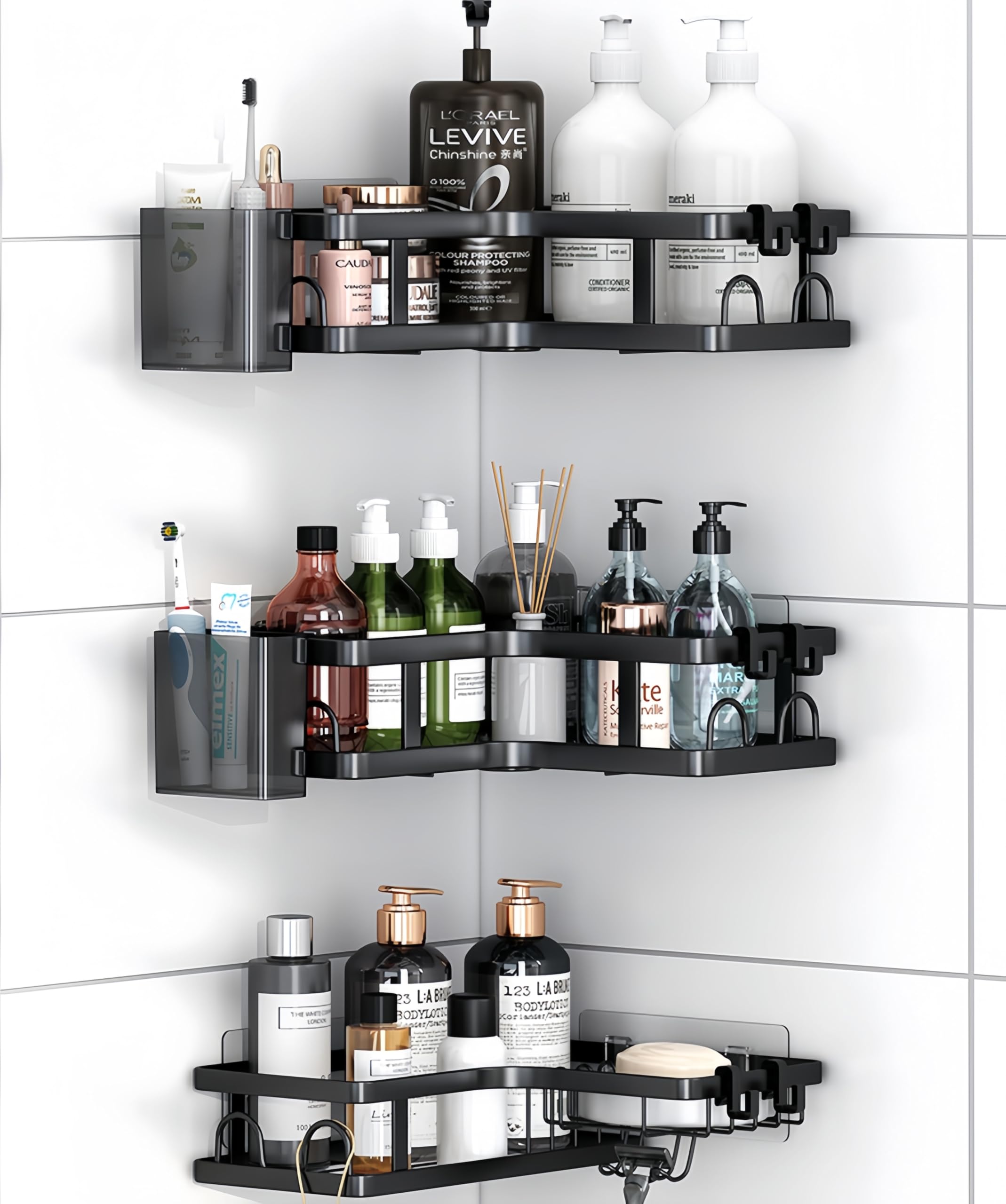 HapiRm Organizador esquinero de ducha – Organizador de ducha con soporte para jabón, soporte para cepillos de dientes y 4 ganchos,