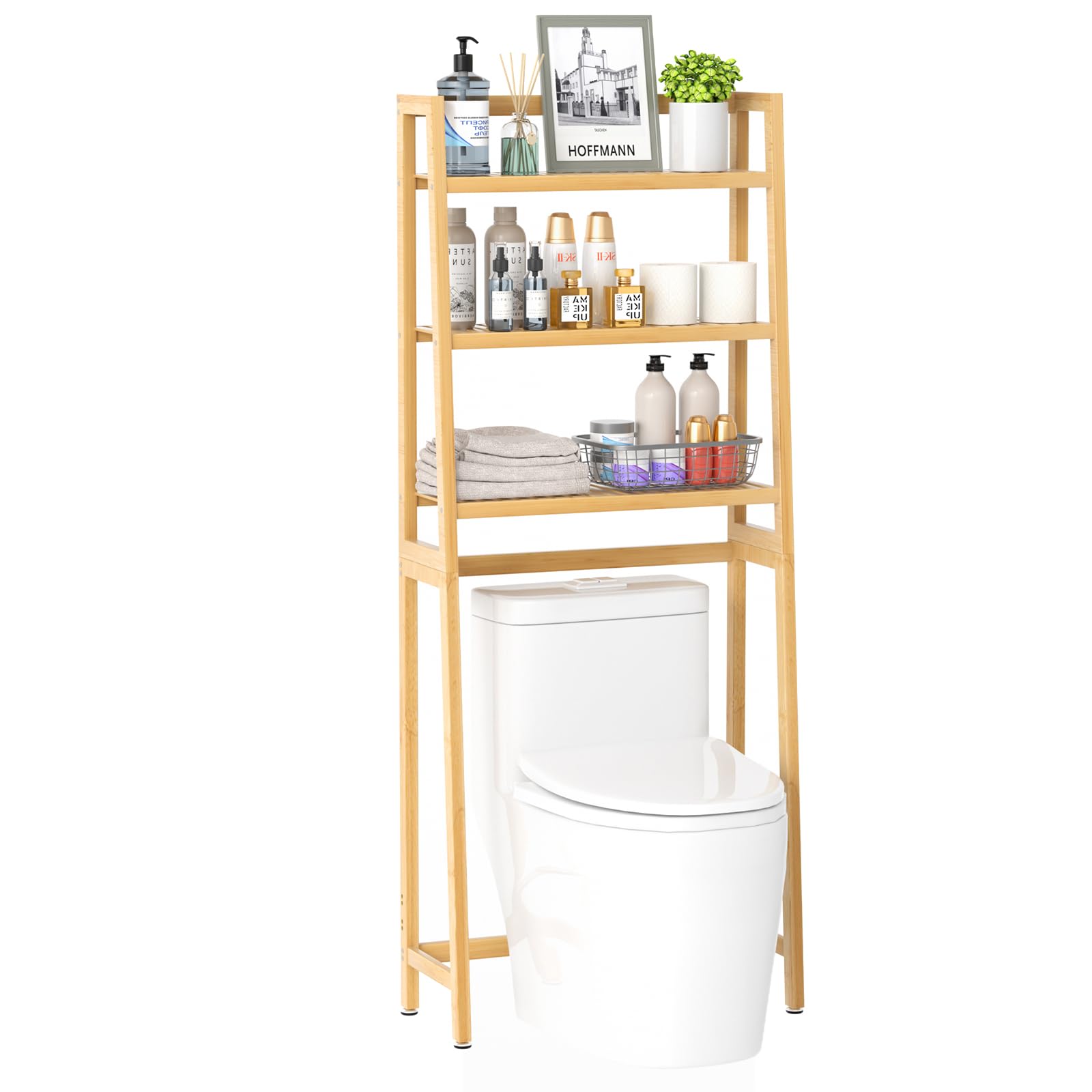 HITOMEN Armario de almacenamiento sobre el inodoro, estante ajustable de bambú de 3 niveles sobre el inodoro, organizador estable