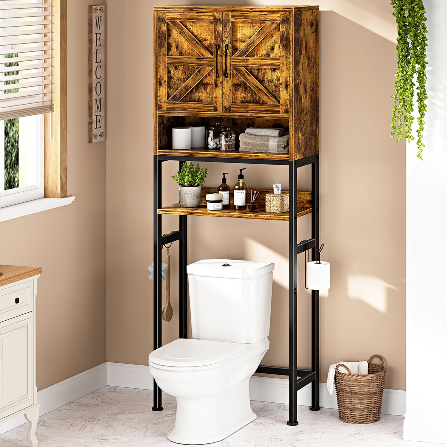 Gabinete de almacenamiento sobre el inodoro, estantes de baño de granja con puertas, organizador independiente, estante estrecho p