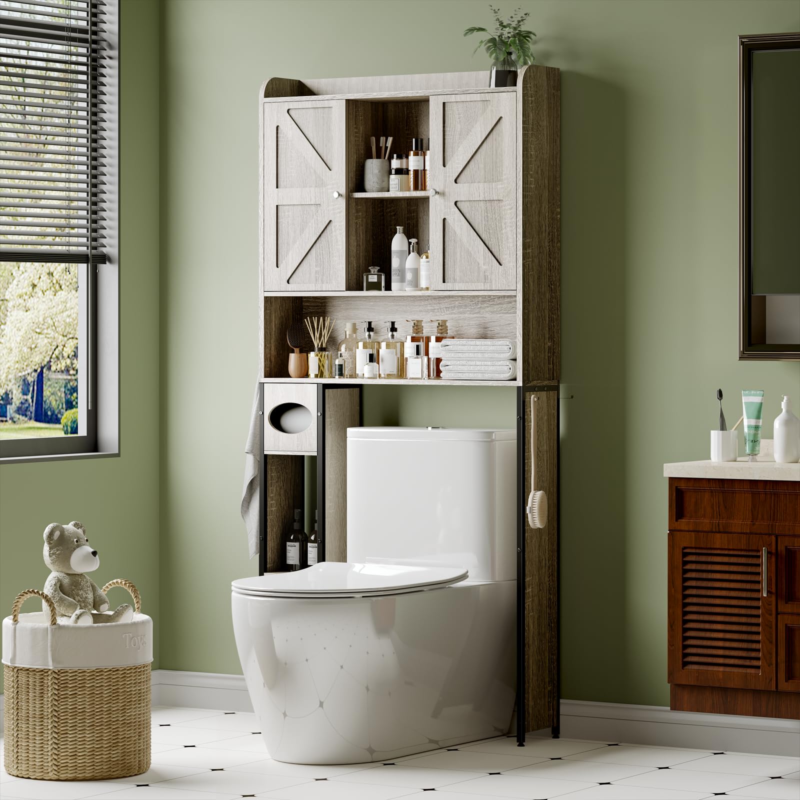 Gabinete de almacenamiento sobre el inodoro, 32 pulgadas de ancho, armario de almacenamiento sobre inodoro con 2 puertas de graner