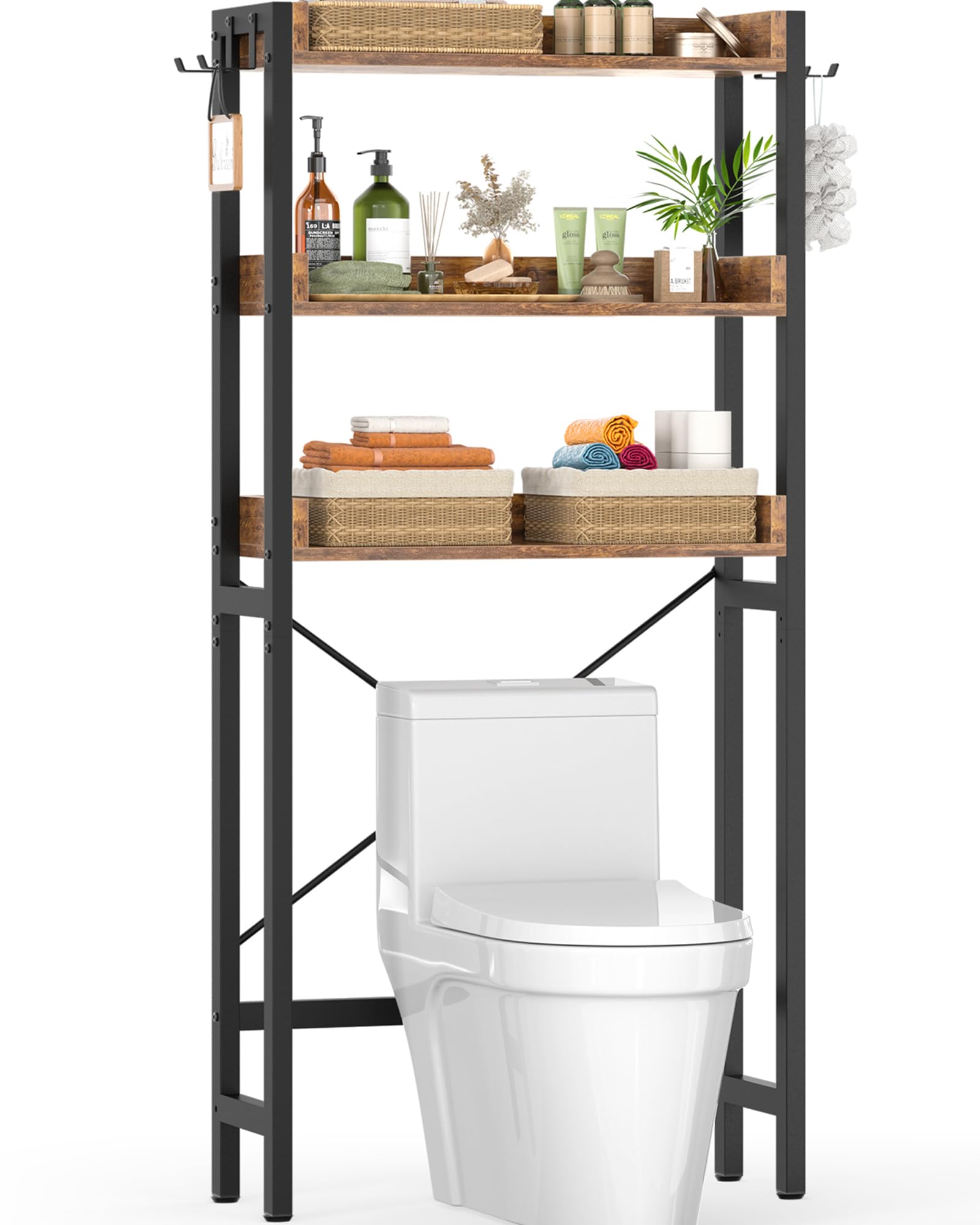 smusei Estante de almacenamiento sobre el inodoro, organizador de baño de 3 niveles sobre el inodoro con ganchos y soporte para pa