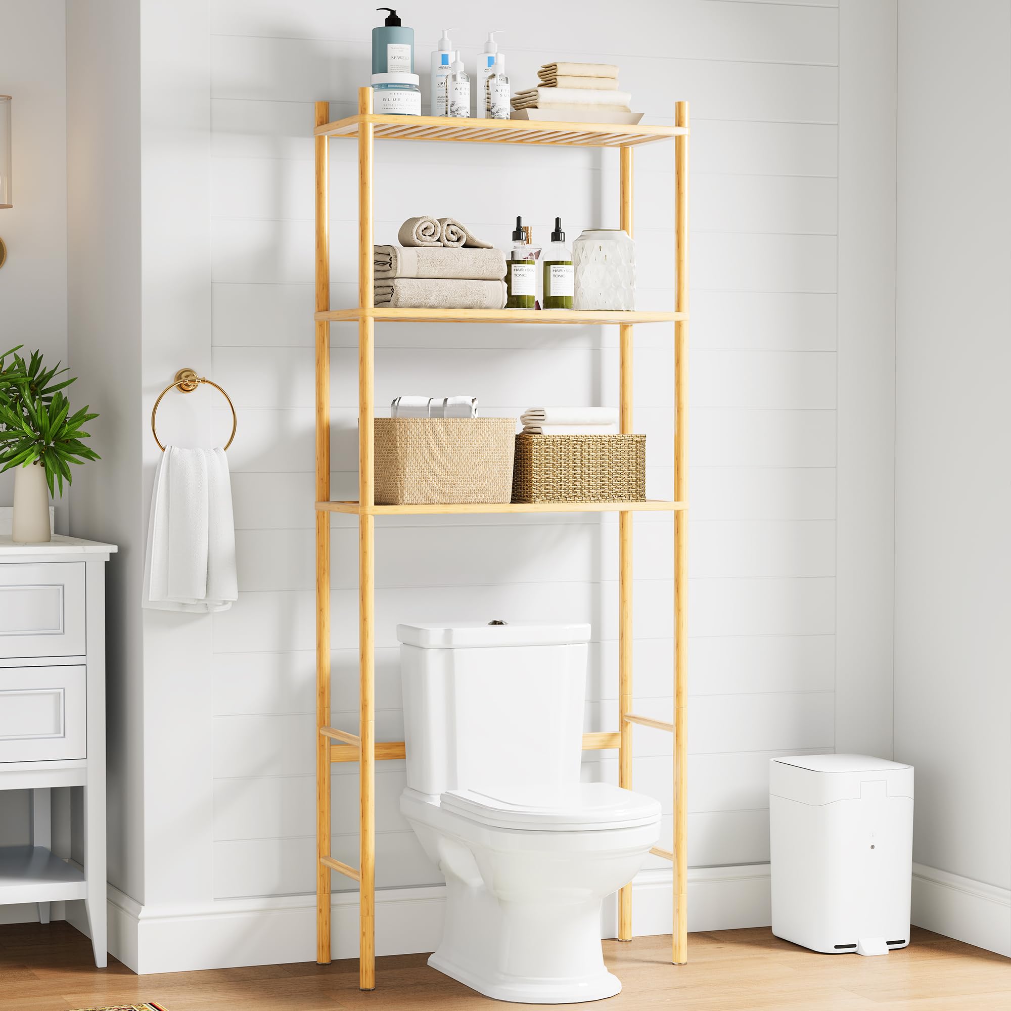 Estante organizador de 3 niveles sobre el inodoro de bambú, estante de almacenamiento de inodoro independiente para baño, ahorro d