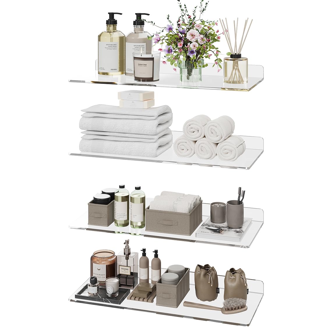 4 estantes de acrílico transparente sobre el inodoro, estantes flotantes de 20 x 8 pulgadas para pared, decoración de baño imperme