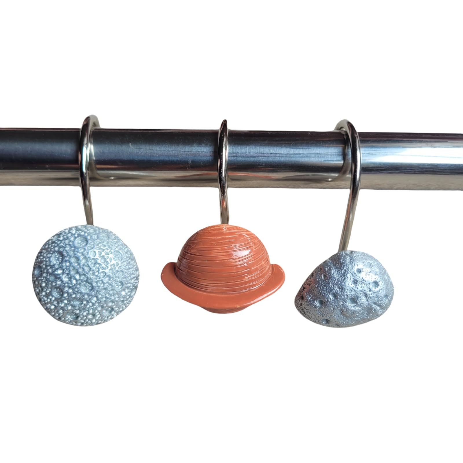 Two Fish Home Space – Juego de 12 ganchos para cortina de ducha, diseño de meteorito de luna, Marte decorativo a prueba de óxido