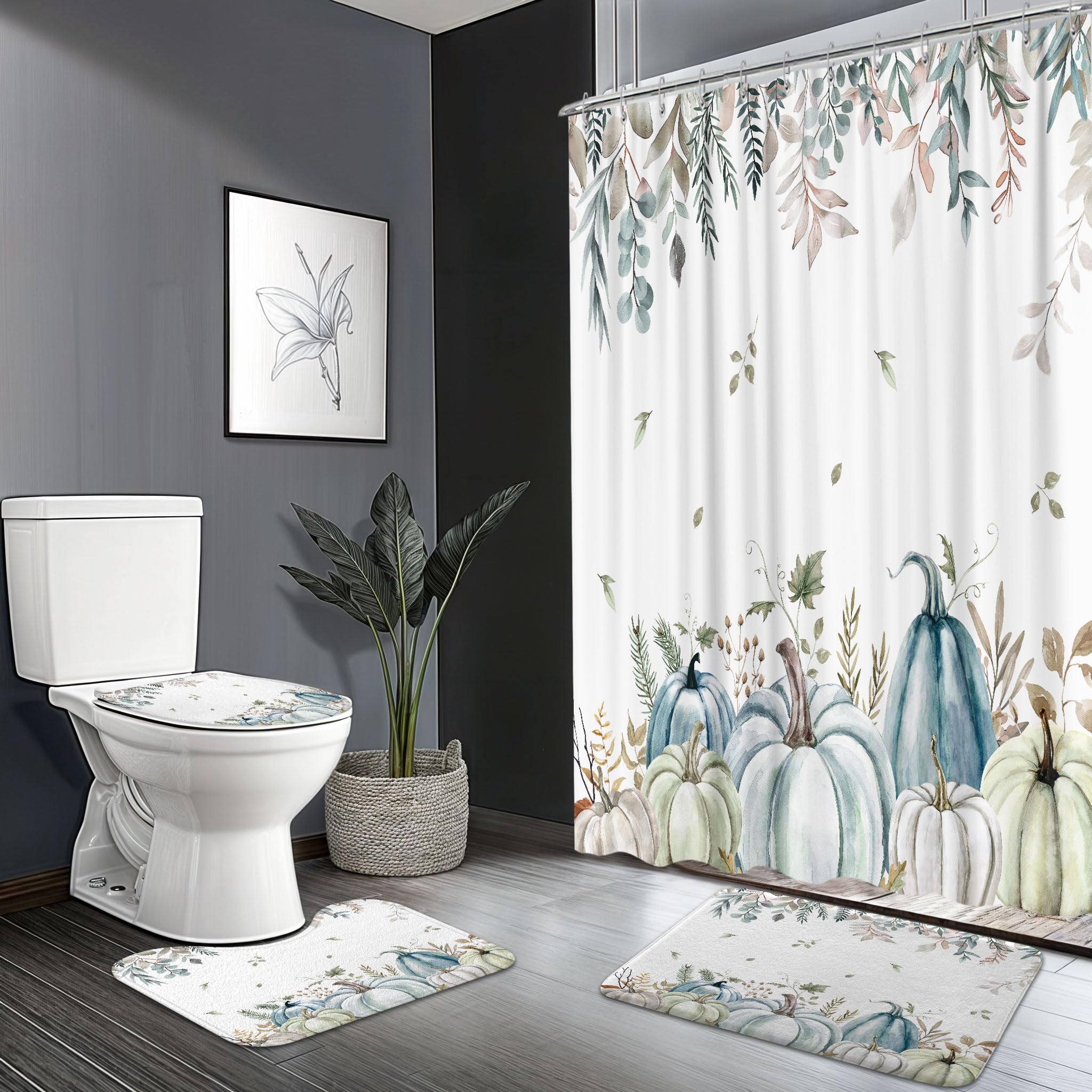 4PCS Fall Pumpkin Shower Curtain Set,Autumn Thanksgiving Harvest Bathroom Sets with Cute Fall Teal Blue Boho Pumpkin Shower Curtai