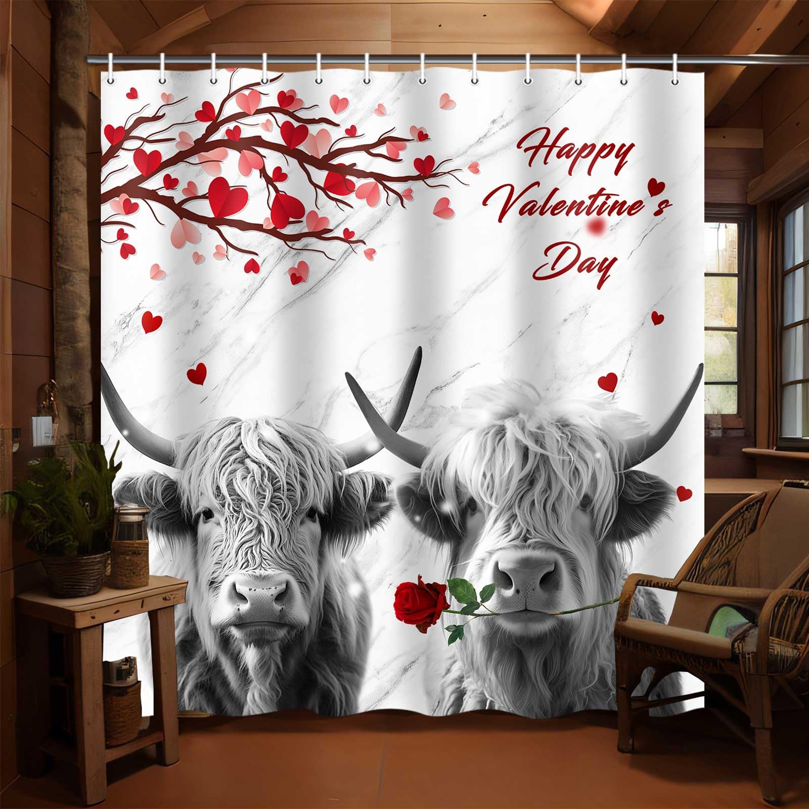 Cortina de ducha para el día de San Valentín, romántica vaca de las tierras altas, pareja de corazones rojos, árbol de San Valentí