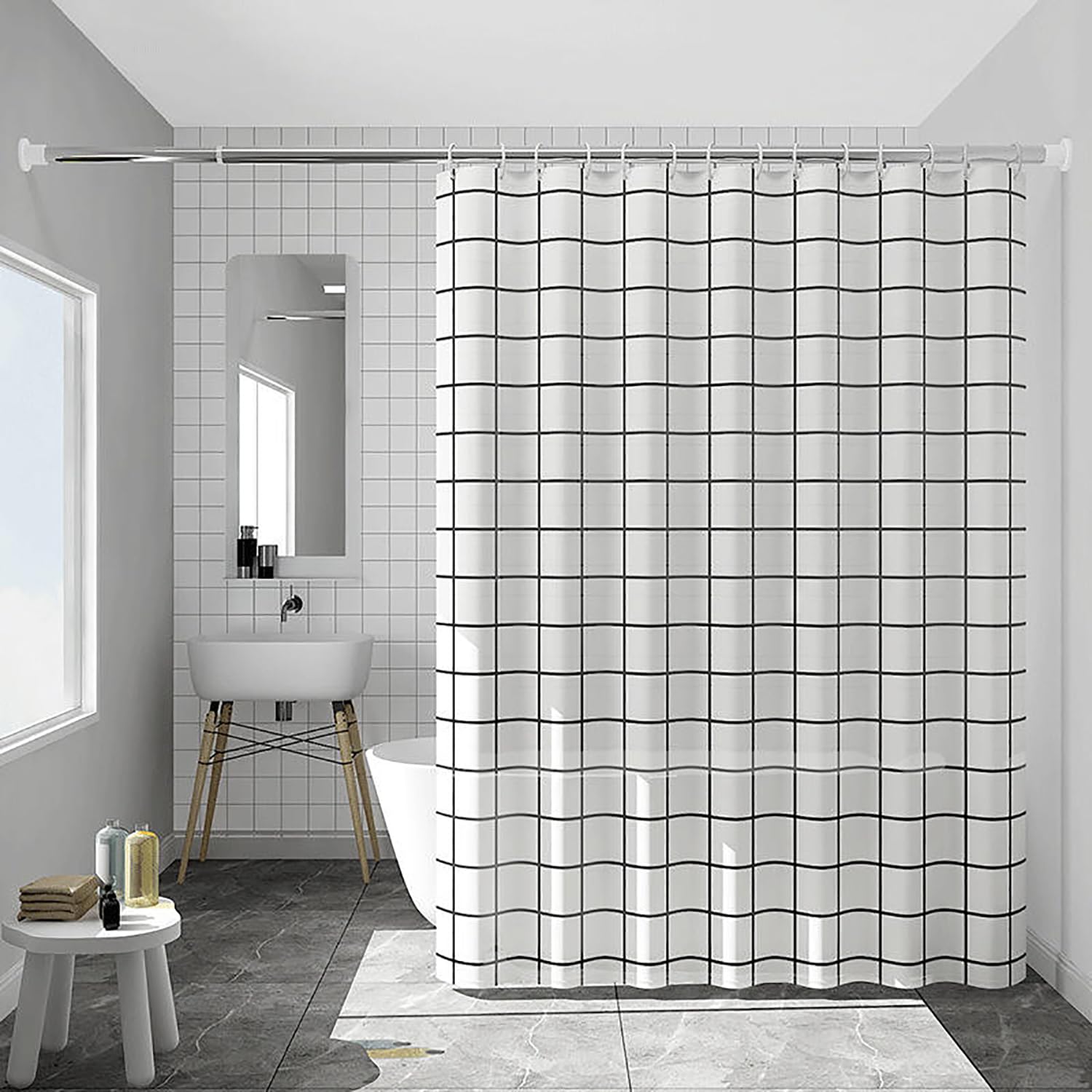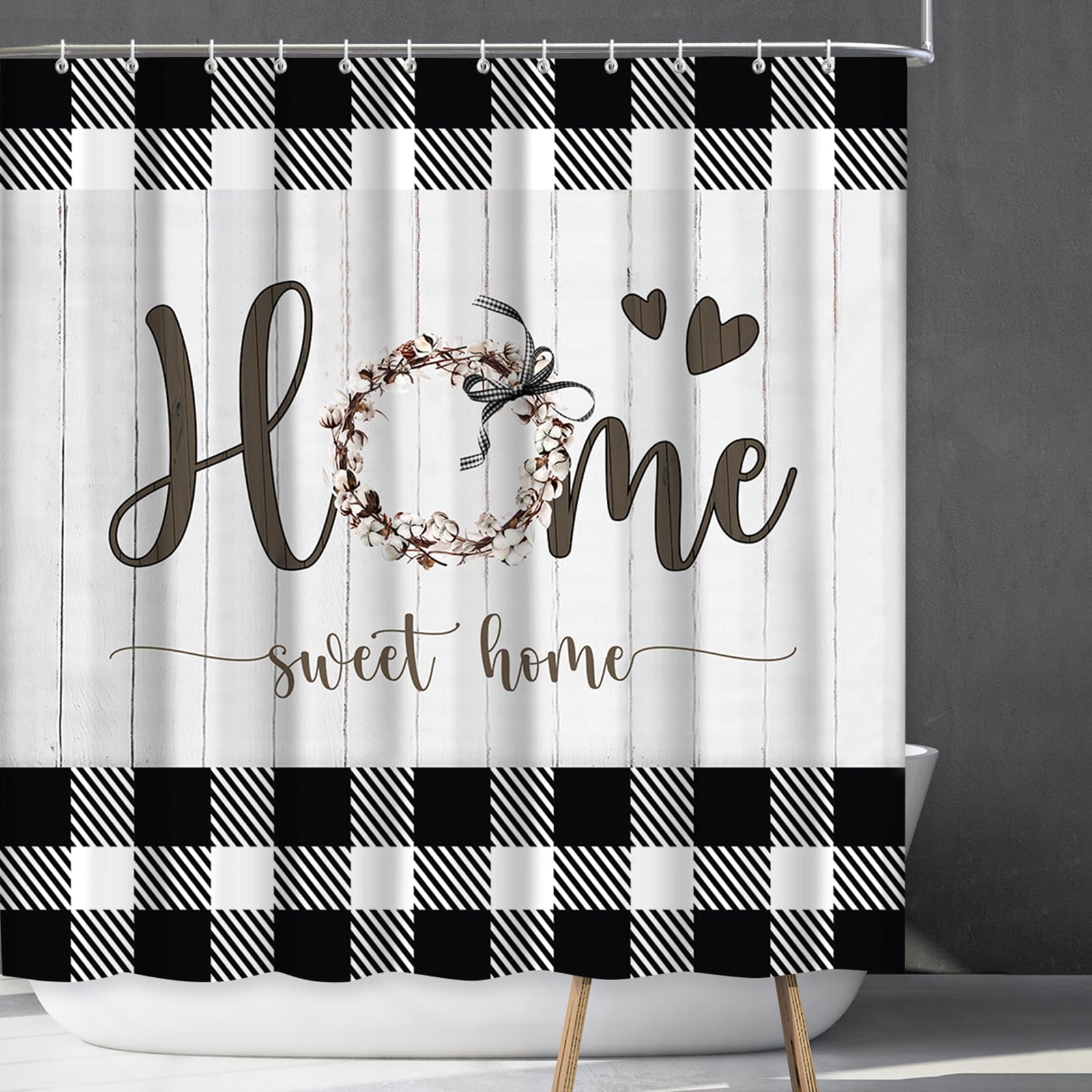 Cortina de ducha de casa de campo a cuadros blancos y negros, cortinas de baño rústicas florales para el hogar, cortina de baño de