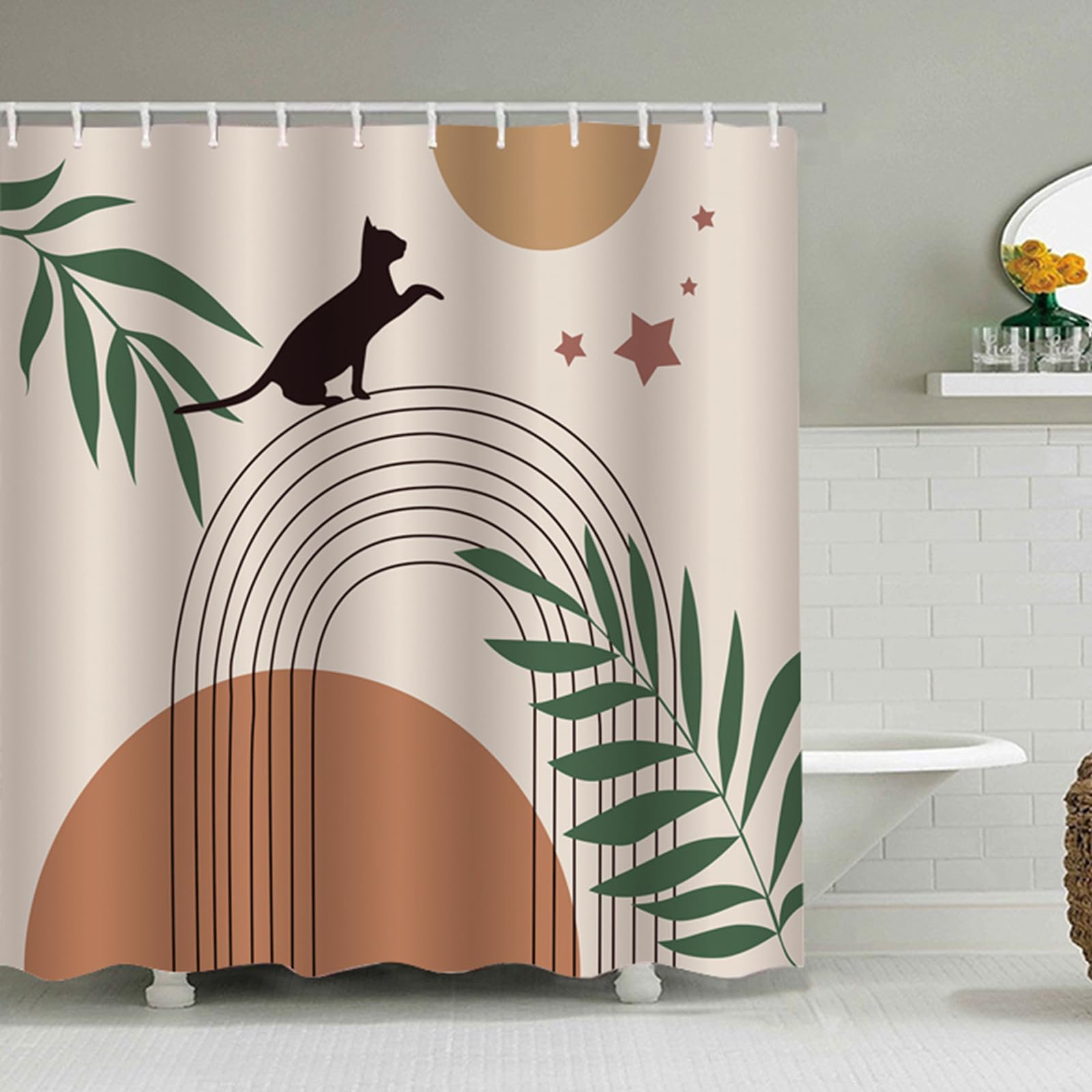 Boho Black Cat Shower Curtain, Mid Century Abstract Arch Sun Modern Minimalist Aesthetic Bathroom Curtains Waterproof Fabric Bath