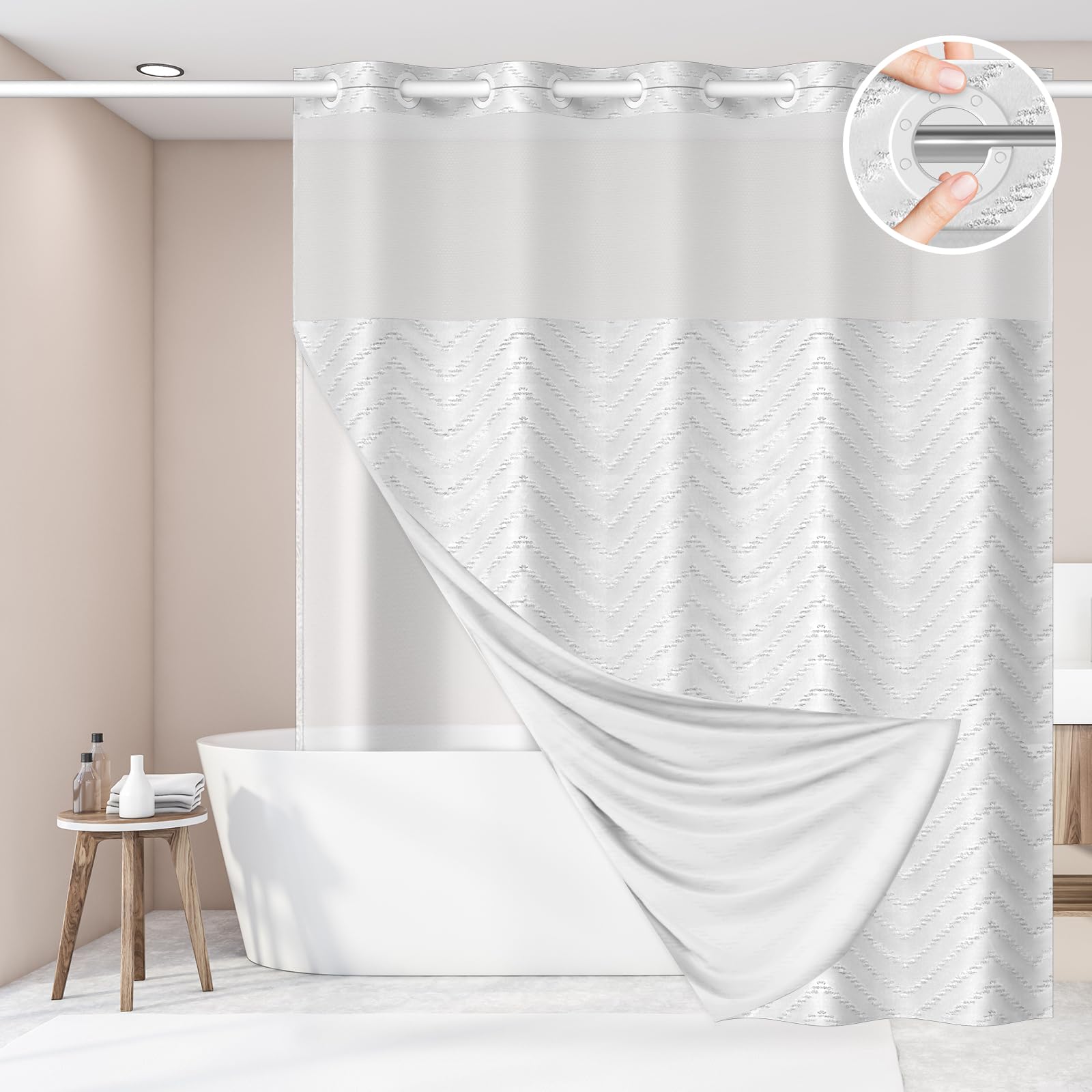 Juego de cortina de ducha extra larga de 86 pulgadas sin gancho y forro a presión, tela impermeable a rayas cheurón blanco, tela l