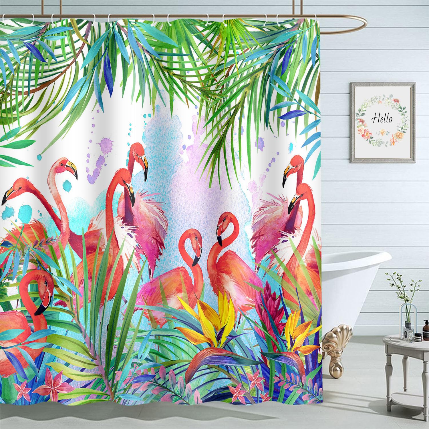 Cortinas de ducha de flamenco rosa, con hojas de palmera, pájaros tropicales, cortina de baño, impermeable, con ganchos, 72 x 72 p