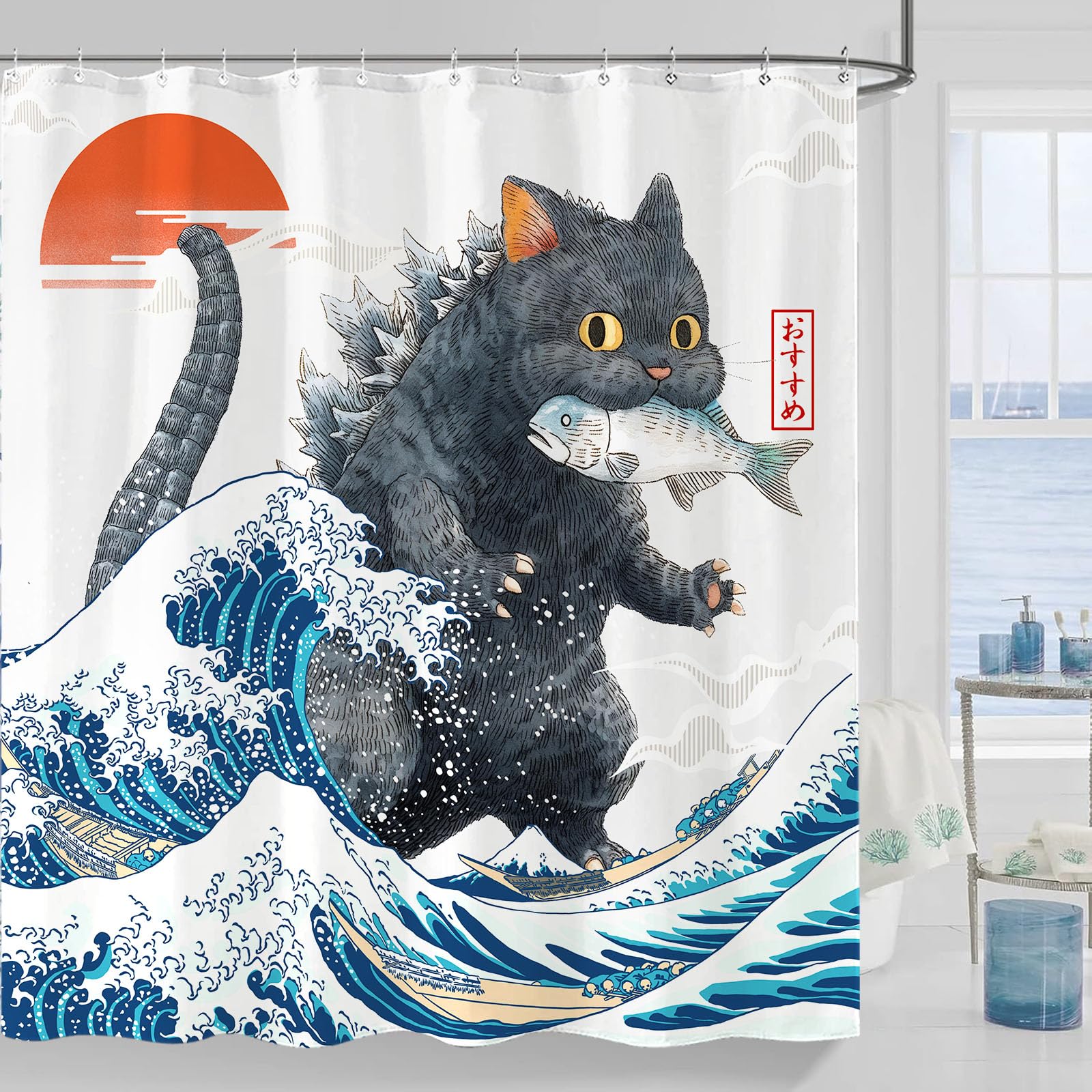 Funny Japanese Cat Shower Curtain, Vintage Cat Riding Shark Japan Anime Sunset Wave Waterproof Shower Curtain with Hooks, Animal F