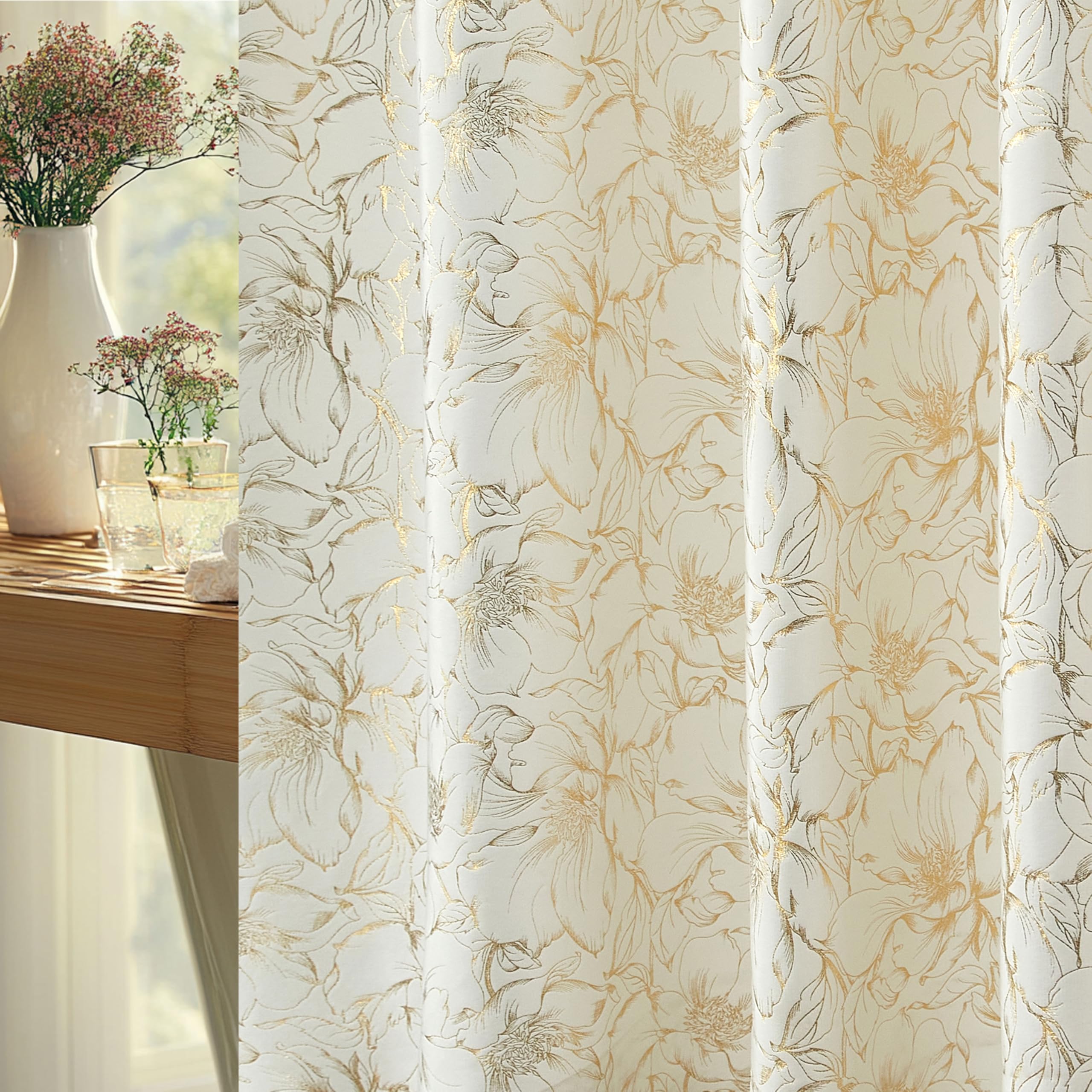 White and Gold Flower Shower Curtain, 72×72 Chic Flower Pattern Velvet Textured Modern Minimalist Fabric Shower Curtain for Bathro