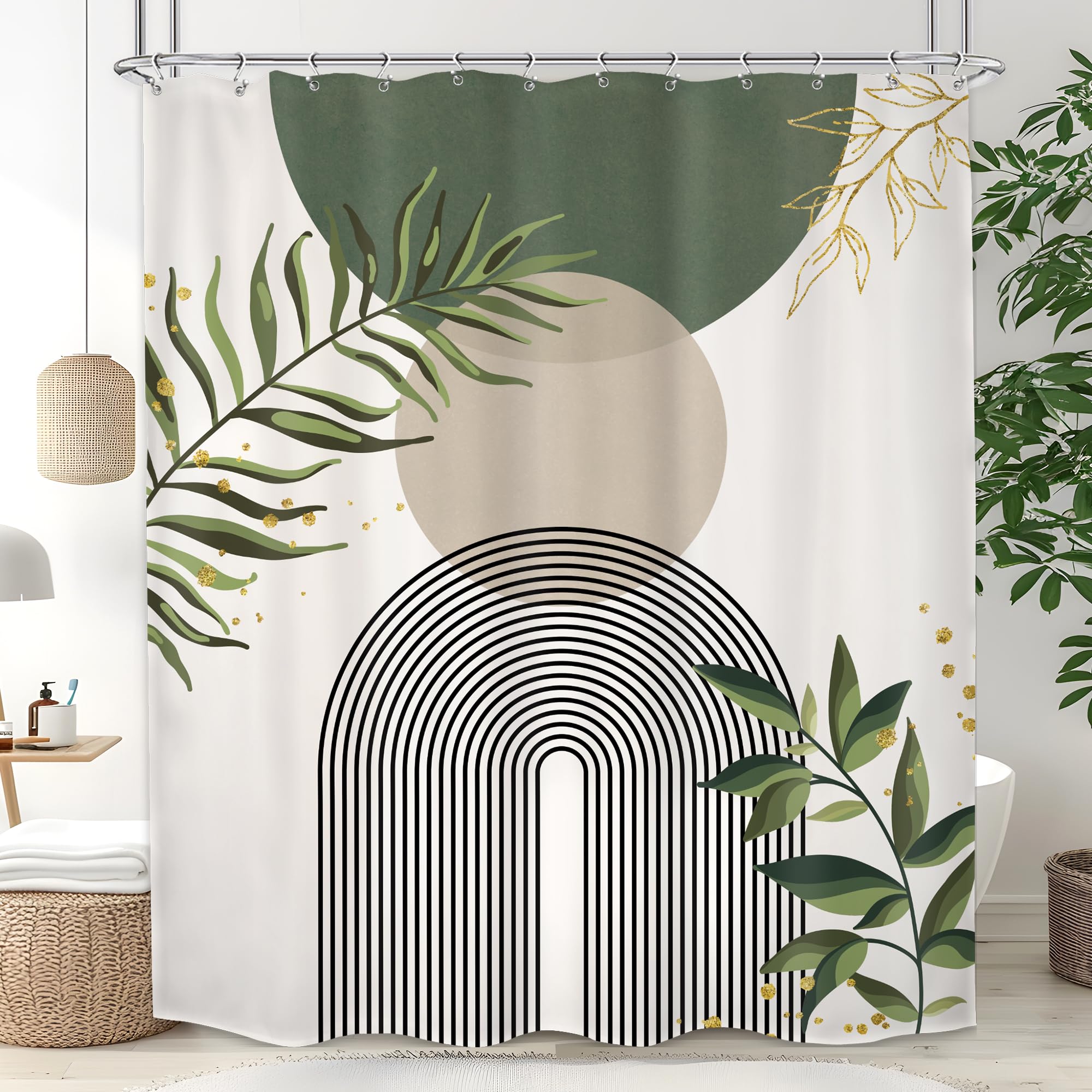 Cortina de ducha bohemia verde salvia de mediados de siglo, moderna, abstracta, tropical, hojas de palma, minimalista, planta geom
