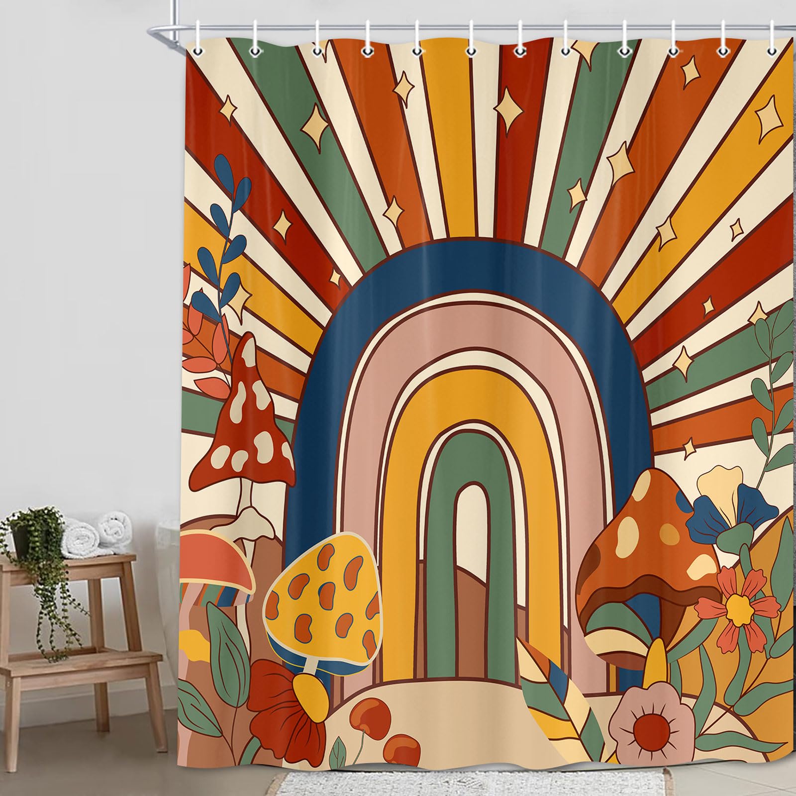 Cortina de ducha retro de los años 70, cortinas de ducha vintage de sol arcoíris para baño, juego de cortinas de baño bohemias abs
