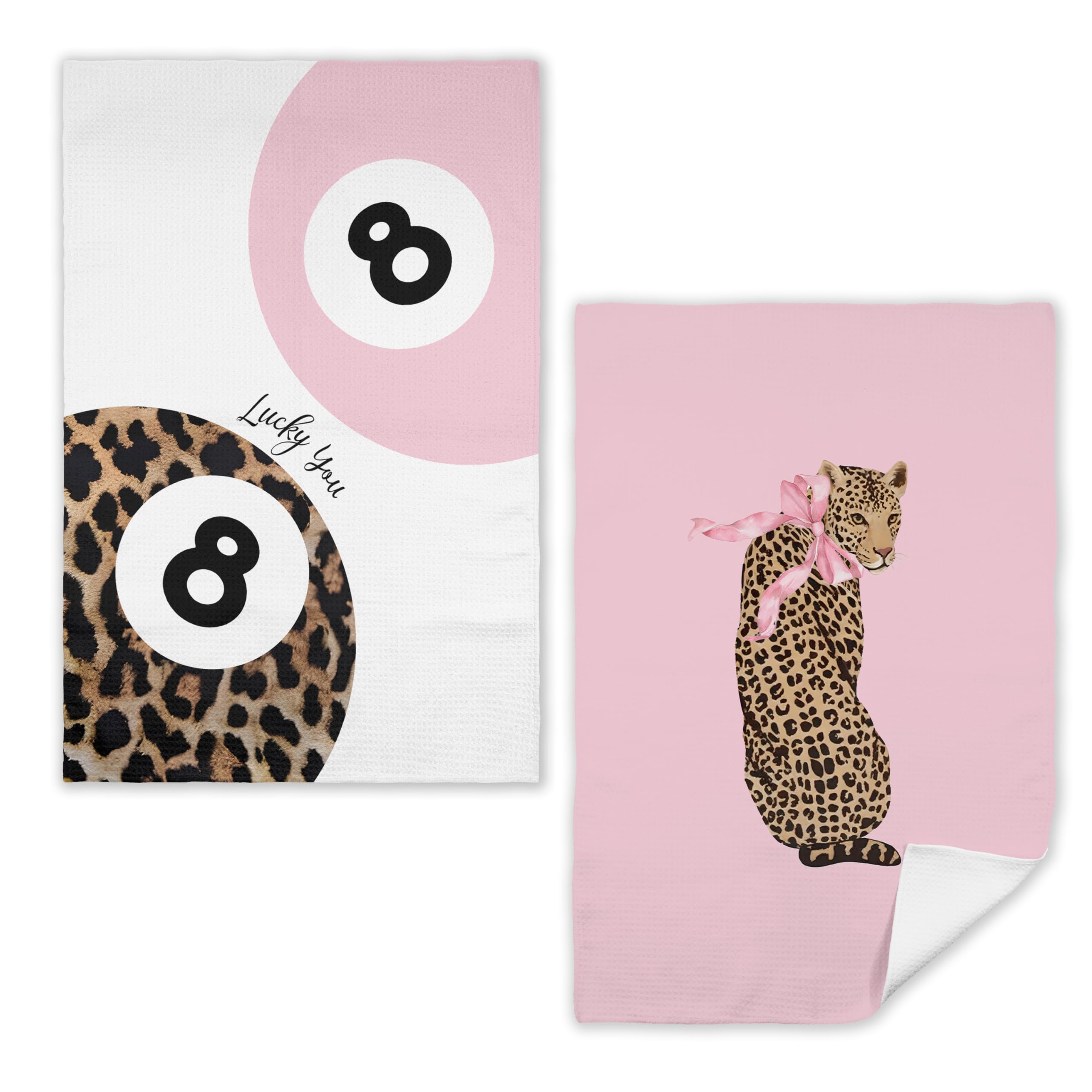 Trendy Lucky Cheetah – Juego de 2 toallas de cocina de 8 bolas, diseño de leopardo rosa funky para decoración de cocina, toallas d