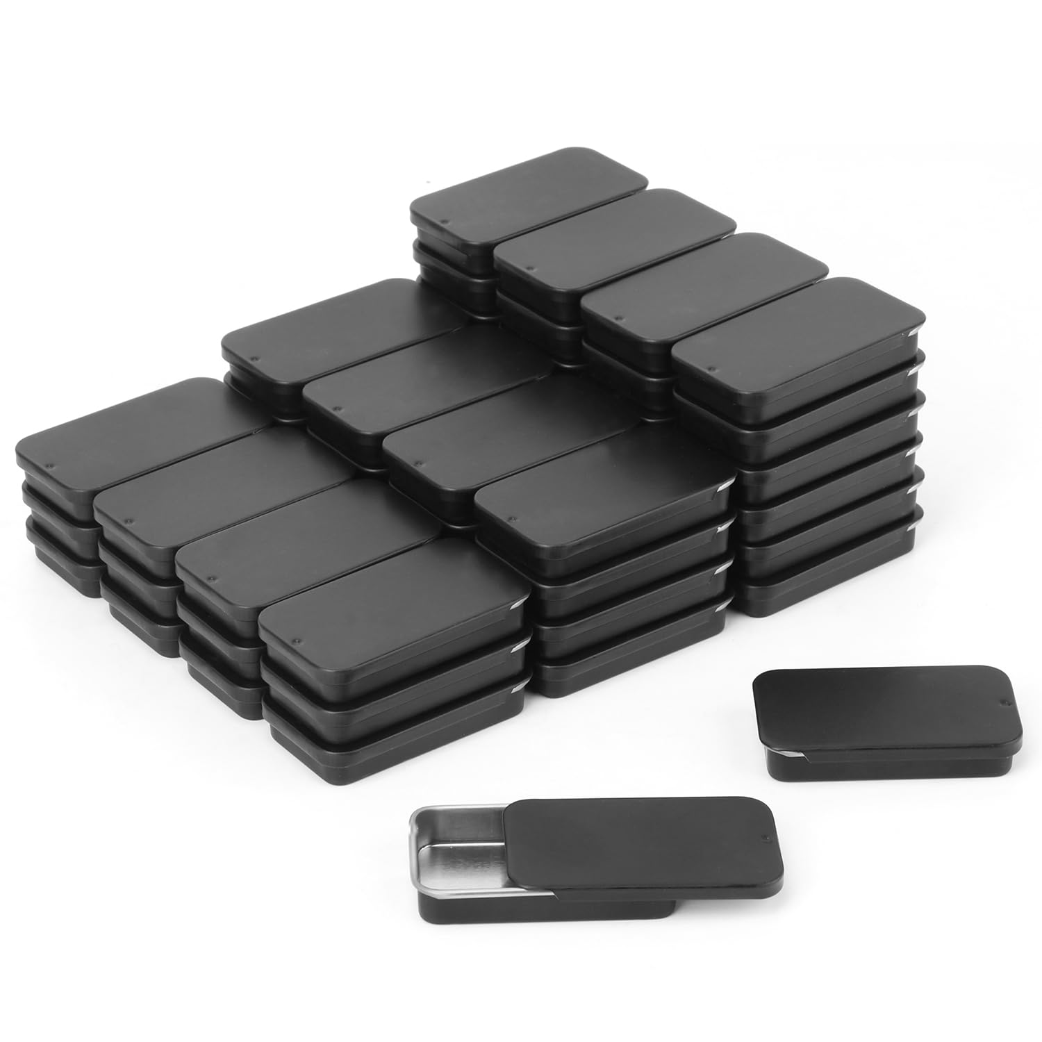 Biugaaufai Paquete de 70 mini cajas rectangulares de metal negras con tapas deslizantes, lata de metal pequeña vacía deslizante, l