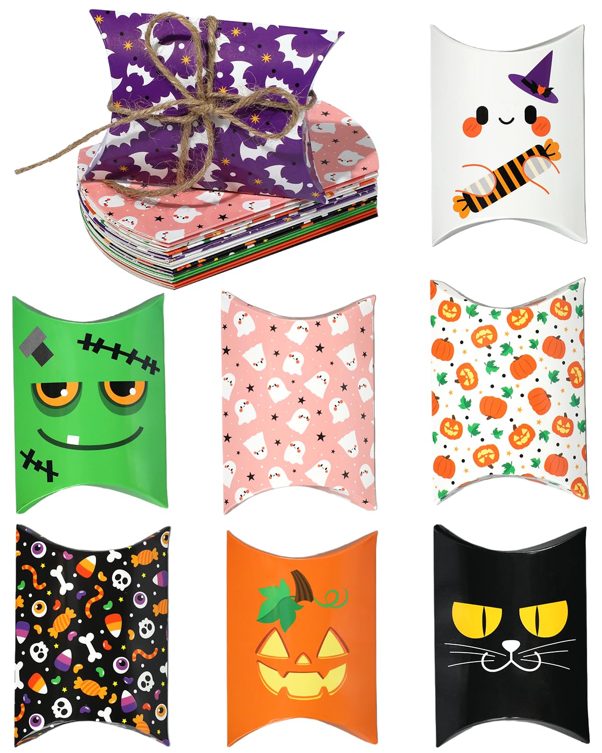 Liobelon 24 Pcs Tiny Halloween Pillow Candy Boxes with 10m Rope, Foldable Treat Gift Boxes for Halloween Parties, Trick-or-Treat S