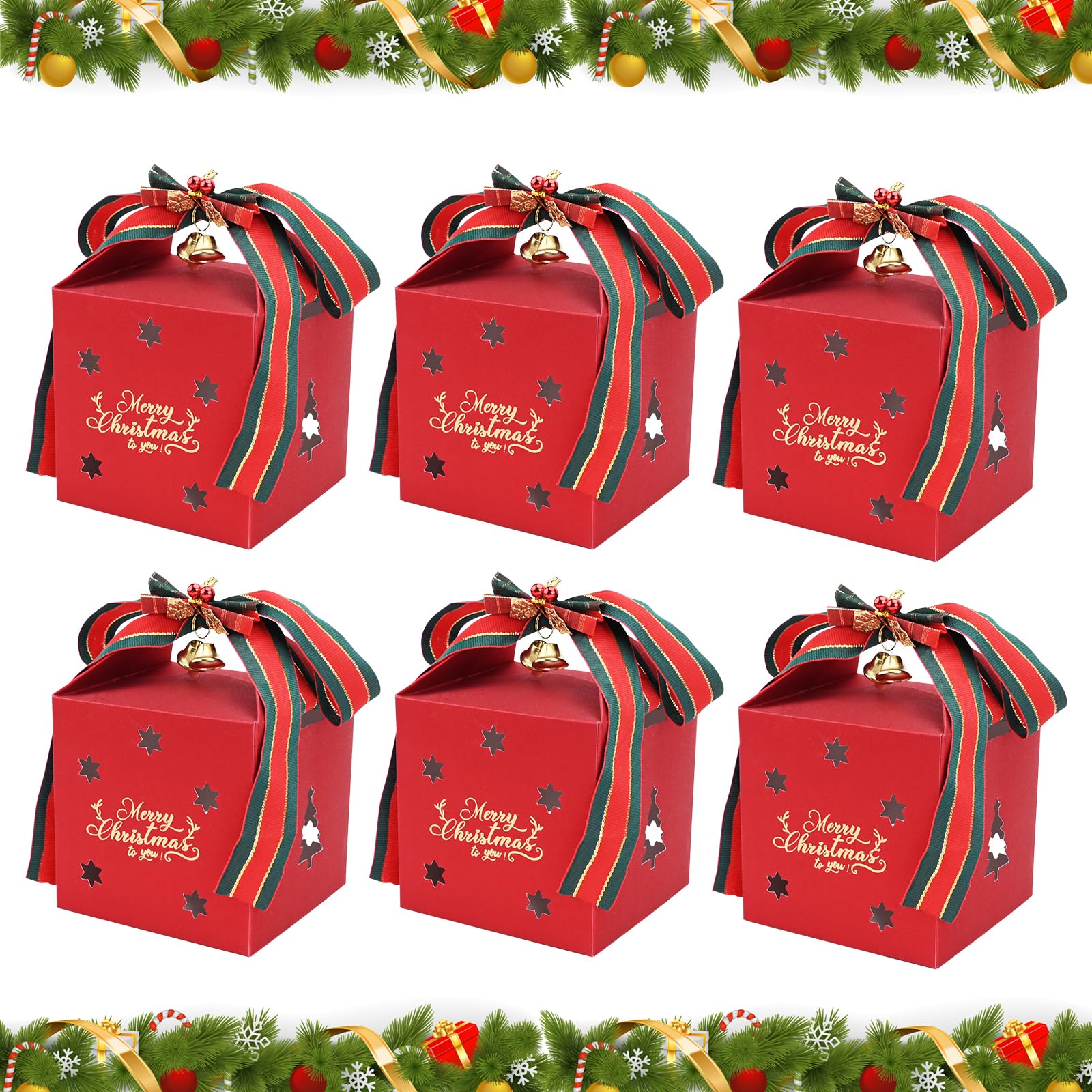 Bekecidi 6 PCS Christmas Gift Boxes with Ribbon and Bow Bells, Christmas Paper Candy Boxes Xmas Party Favour Boxes Treat Boxes Cup