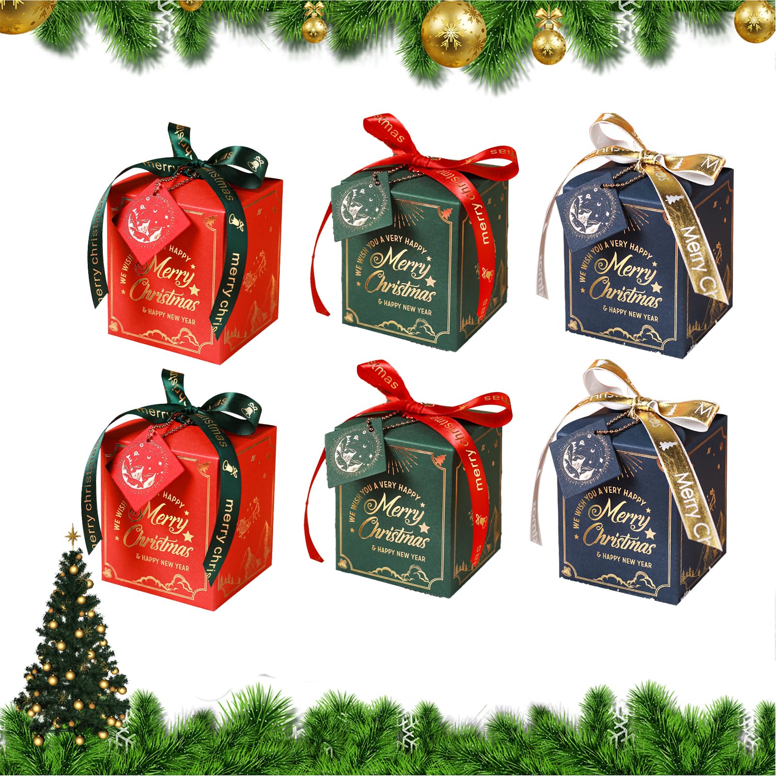 Bekecidi 6 cajas de regalo de Navidad con cinta y etiquetas, cajas de dulces de papel de Navidad, cajas de regalo de fiesta de Nav