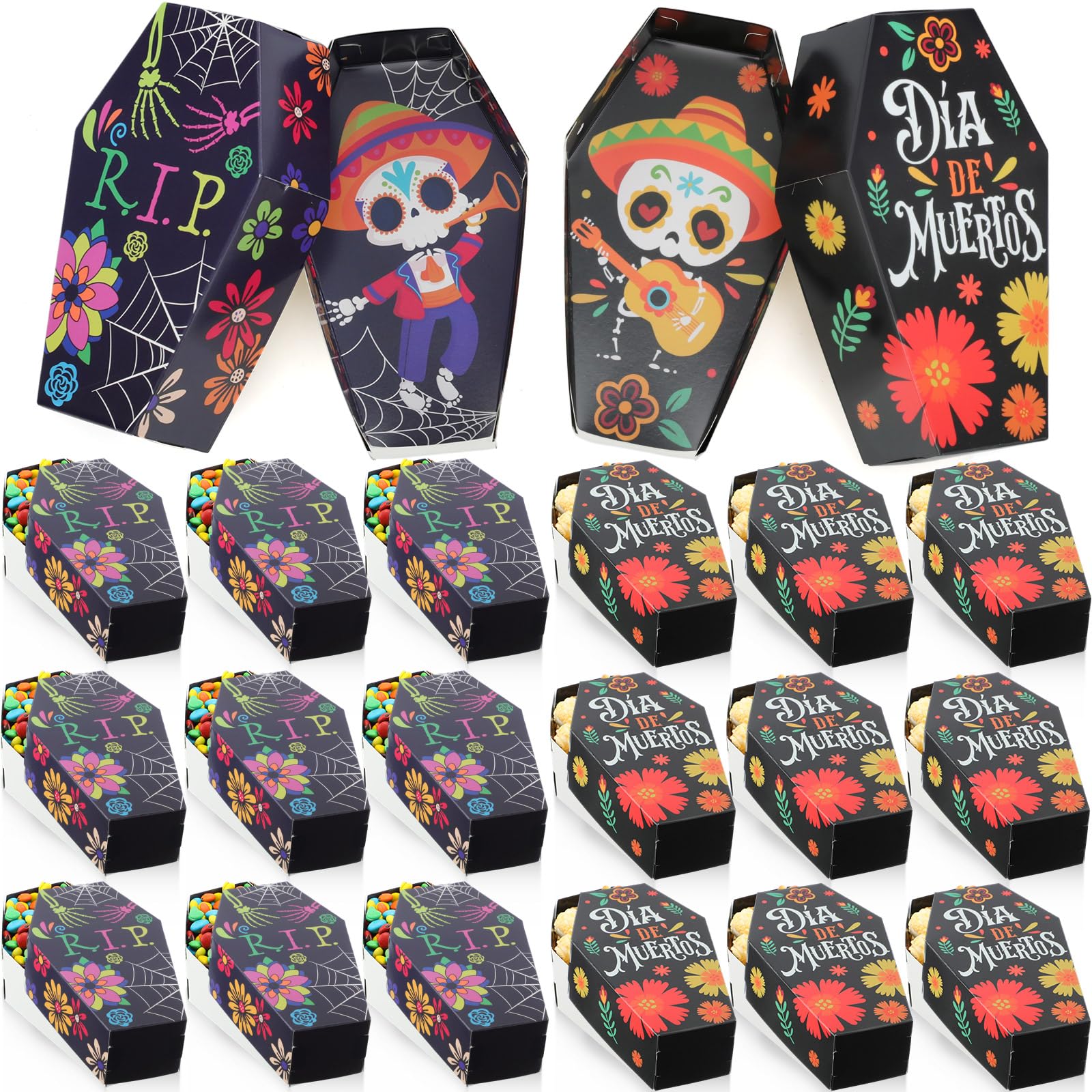Meanplan 24 cajas de dulces con forma de ataúd del Día de los Muertos, cajas de regalo de golosinas con calavera, paquetes de alim