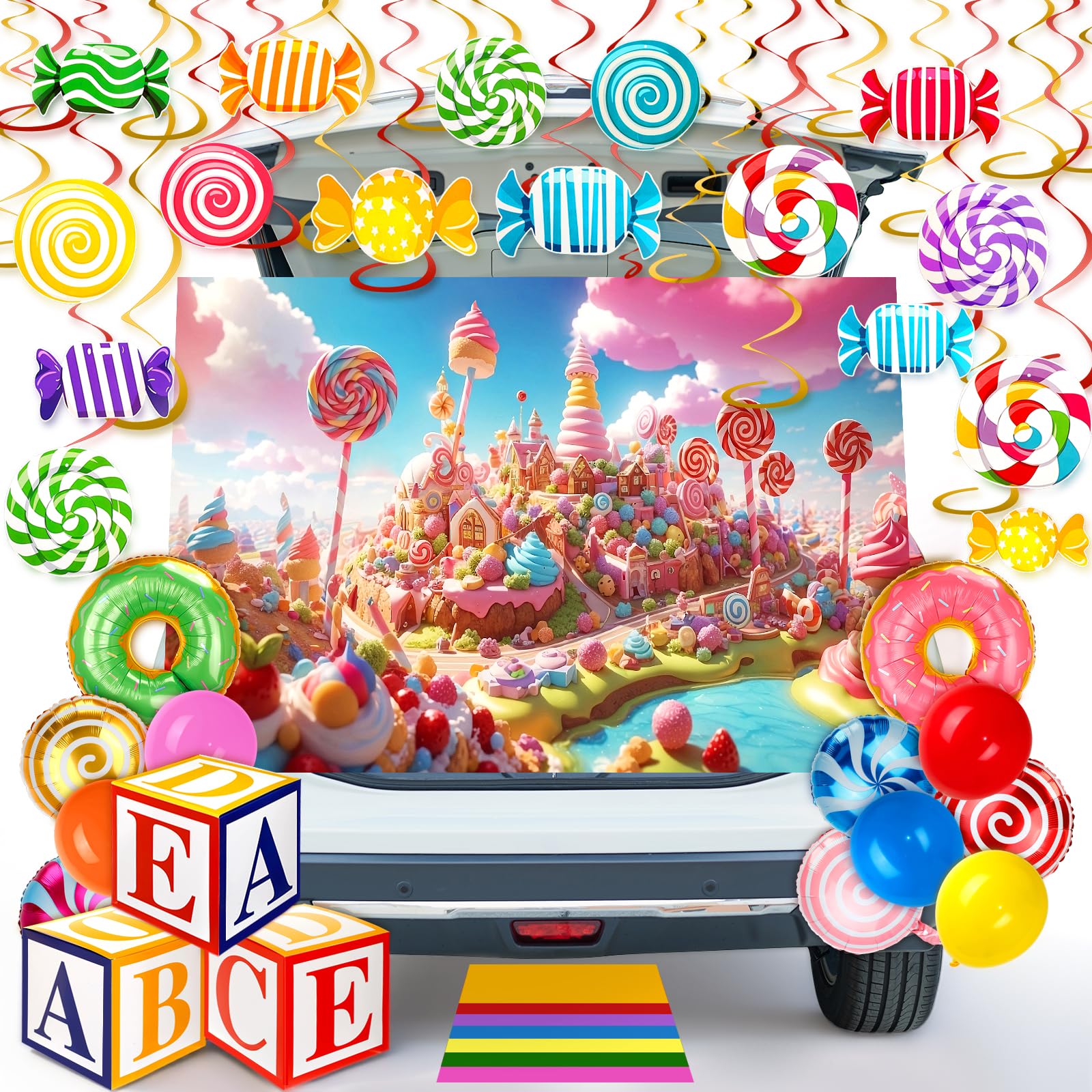 Soulchen 37pcs Trunk or Treat Car Decorations Kit Candy Halloween Decoration with Backdrop Banner Candy Balloons Hanging Swirls an