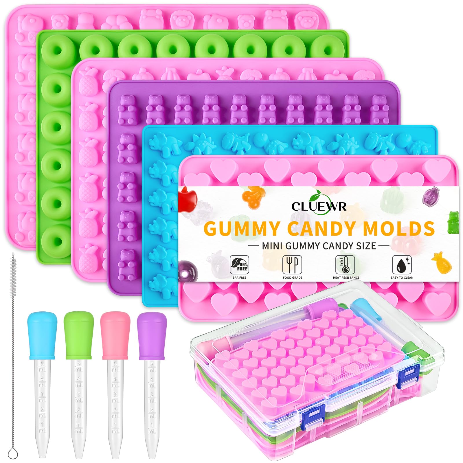 Juego de 6 moldes de caramelos de gomitas, moldes de silicona para aperitivos de dinosaurio con 4 goteros, caja de almacenamiento
