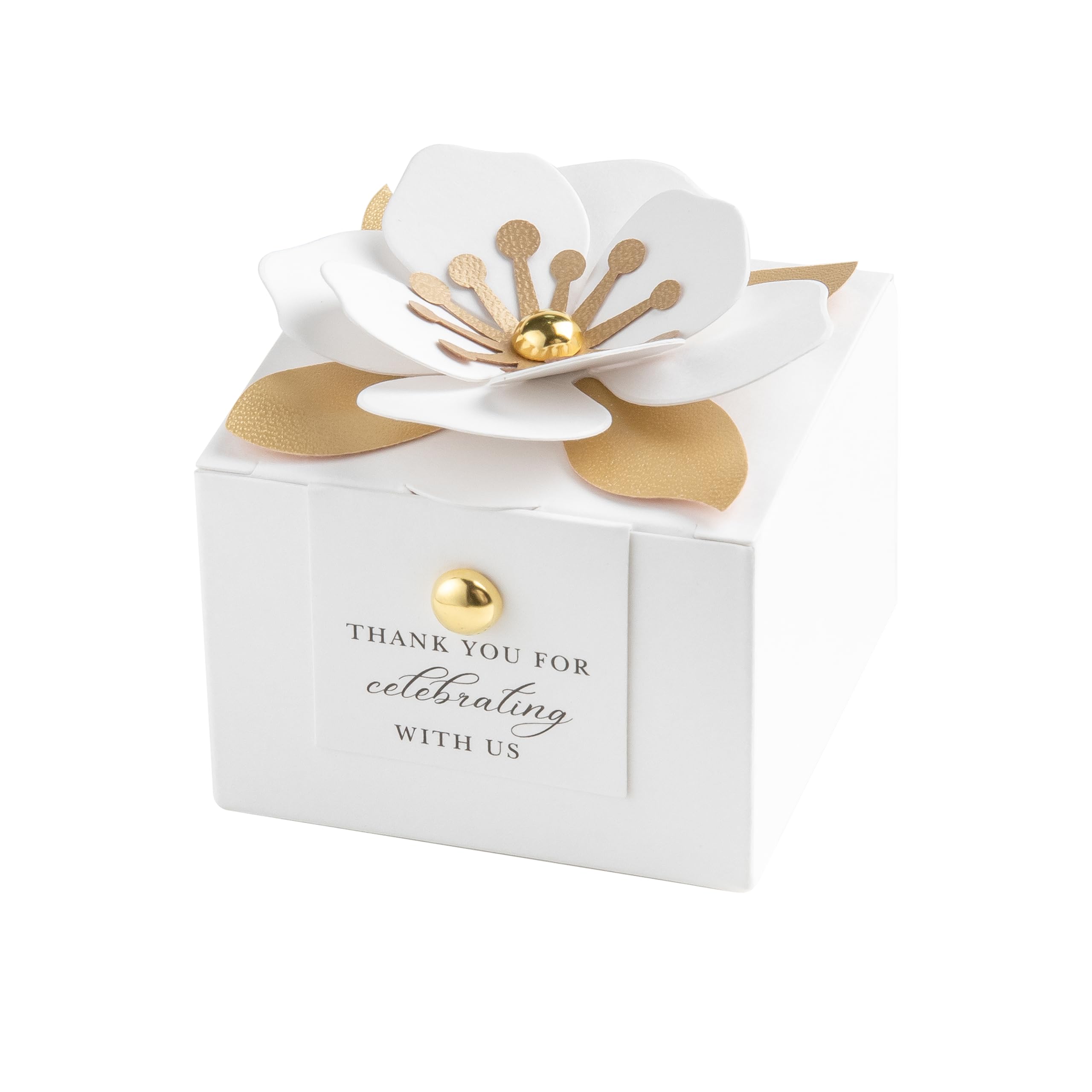 FEIYI 20 cajas de dulces, cajas de regalo blancas 3 en 1 con decoración floral, etiquetas de agradecimiento blancas, envoltura de