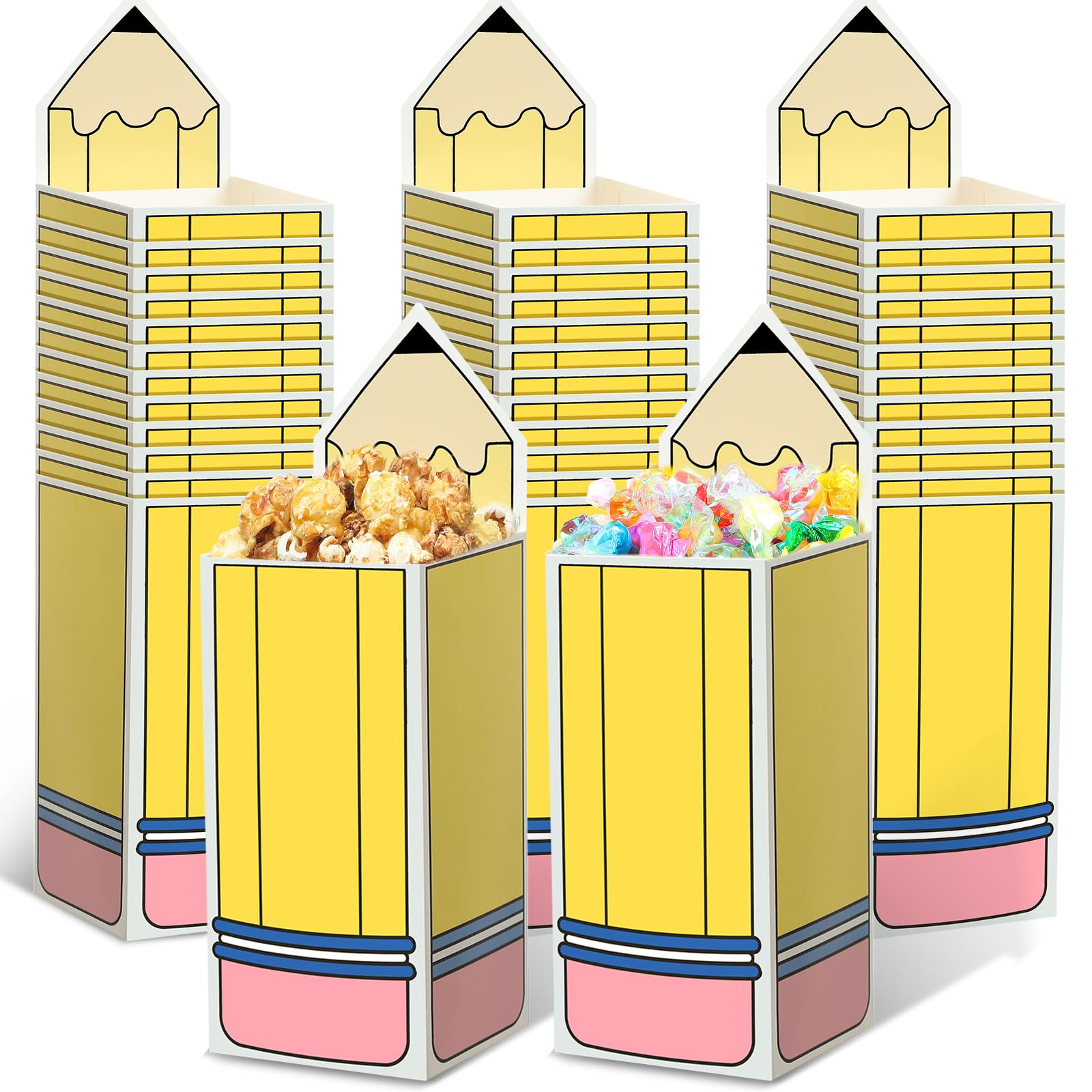 Harloon 50 cajas de regalo para lápices de vuelta a la escuela, soportes para palomitas de maíz, bolsas con forma de lápiz a grane