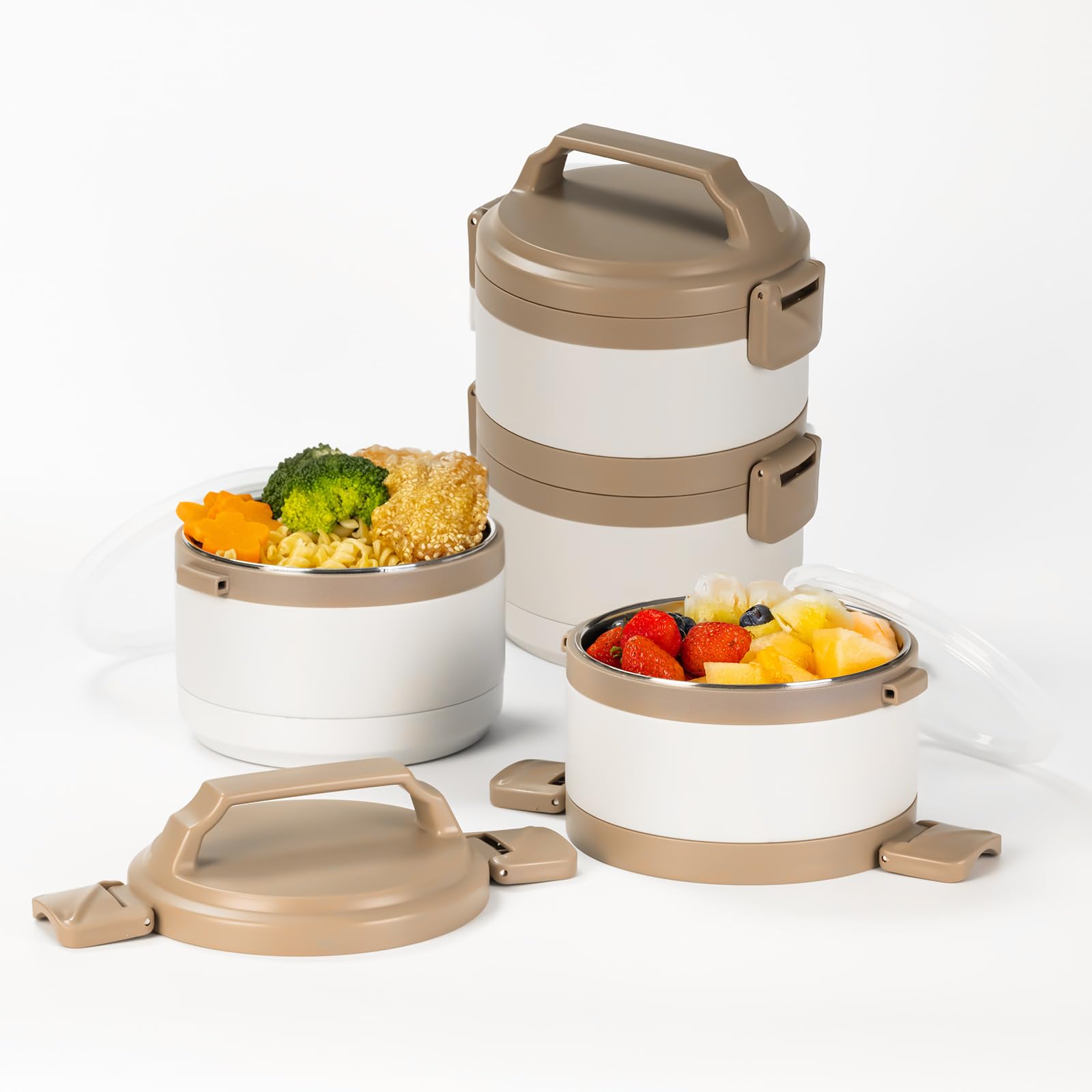 Juego de 3 recipientes de almuerzo aislados portátiles para adultos, caja Bento apilable de acero inoxidable para comida caliente