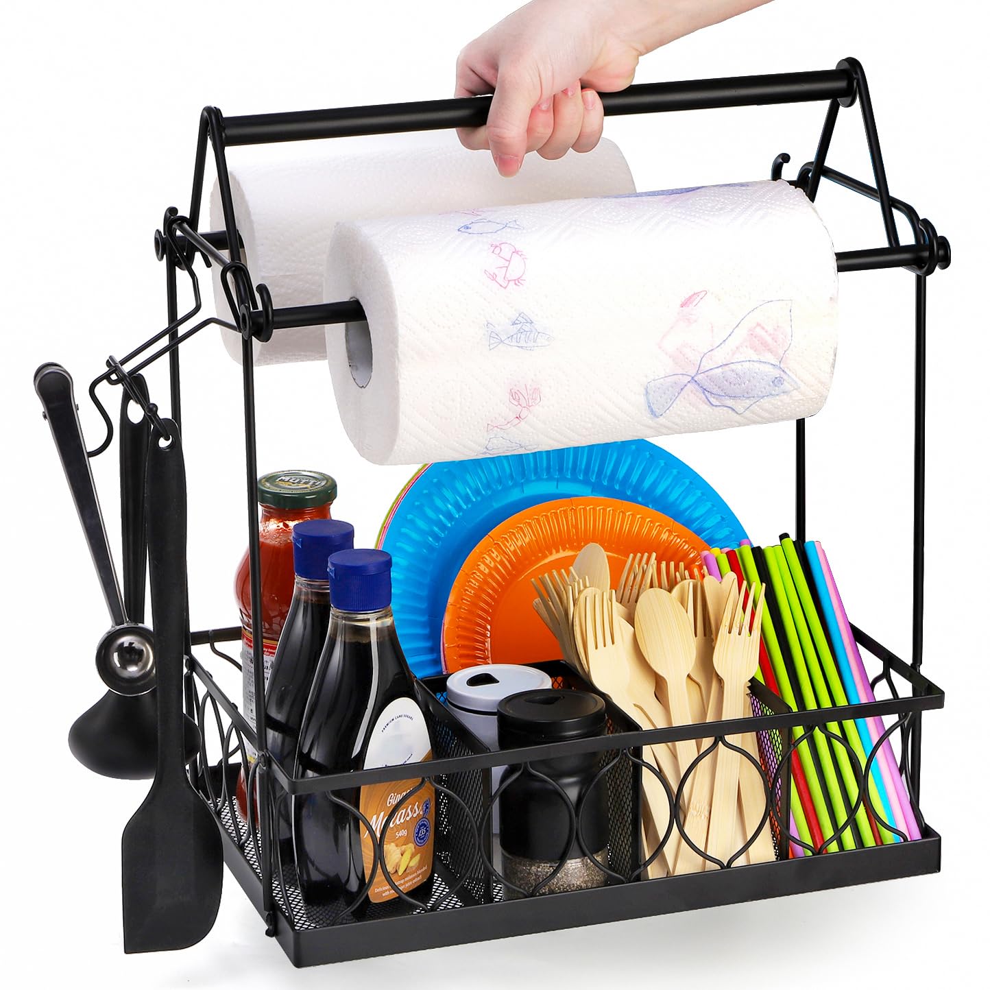 Elsjoy Organizador de parrilla con soporte para toallas de papel, organizador grande de utensilios de picnic con asa, organizador