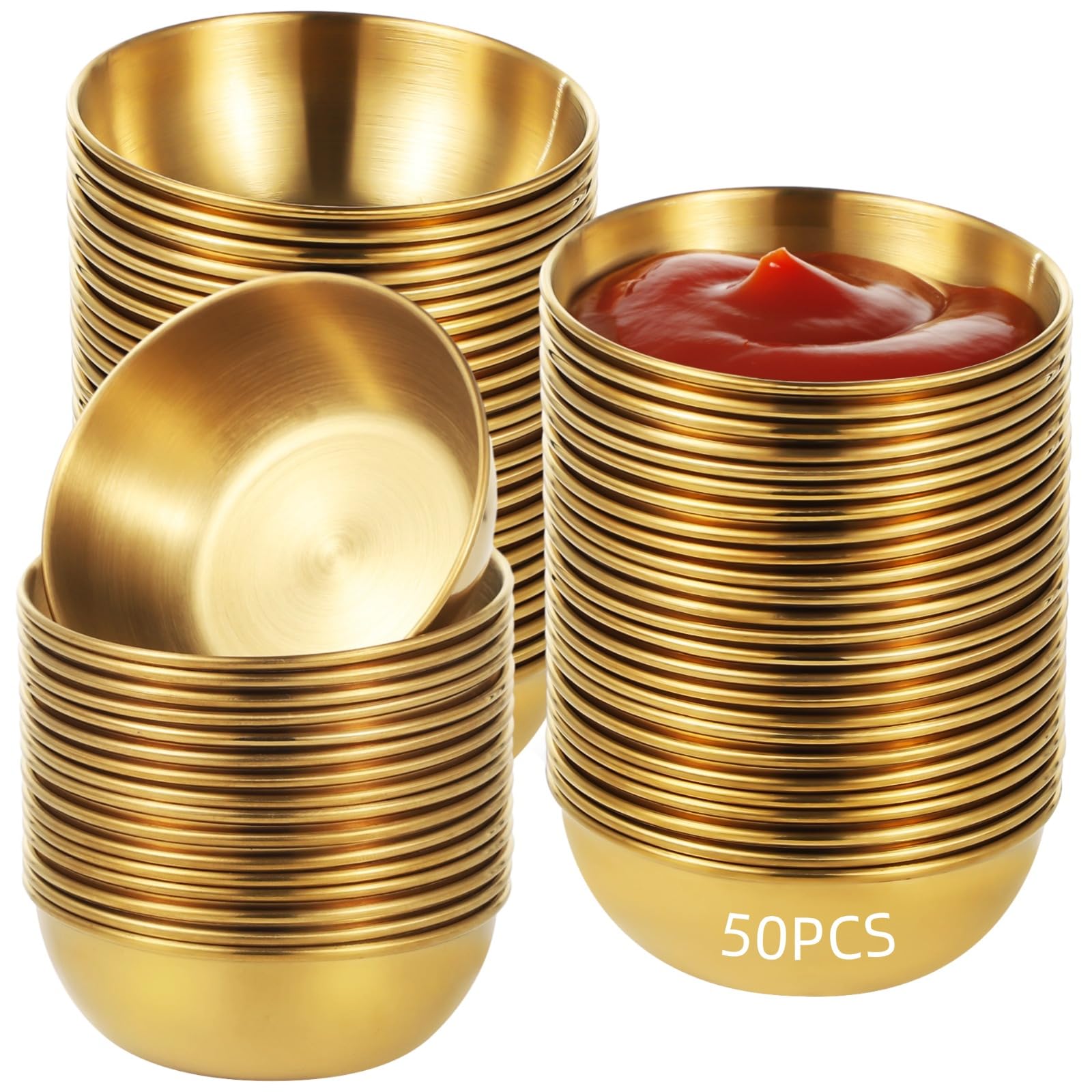 50 cuencos redondos dorados para salsas, 3.2 x 1.2 pulgadas, tazas de acero inoxidable para salsa, recipiente pequeño para condime