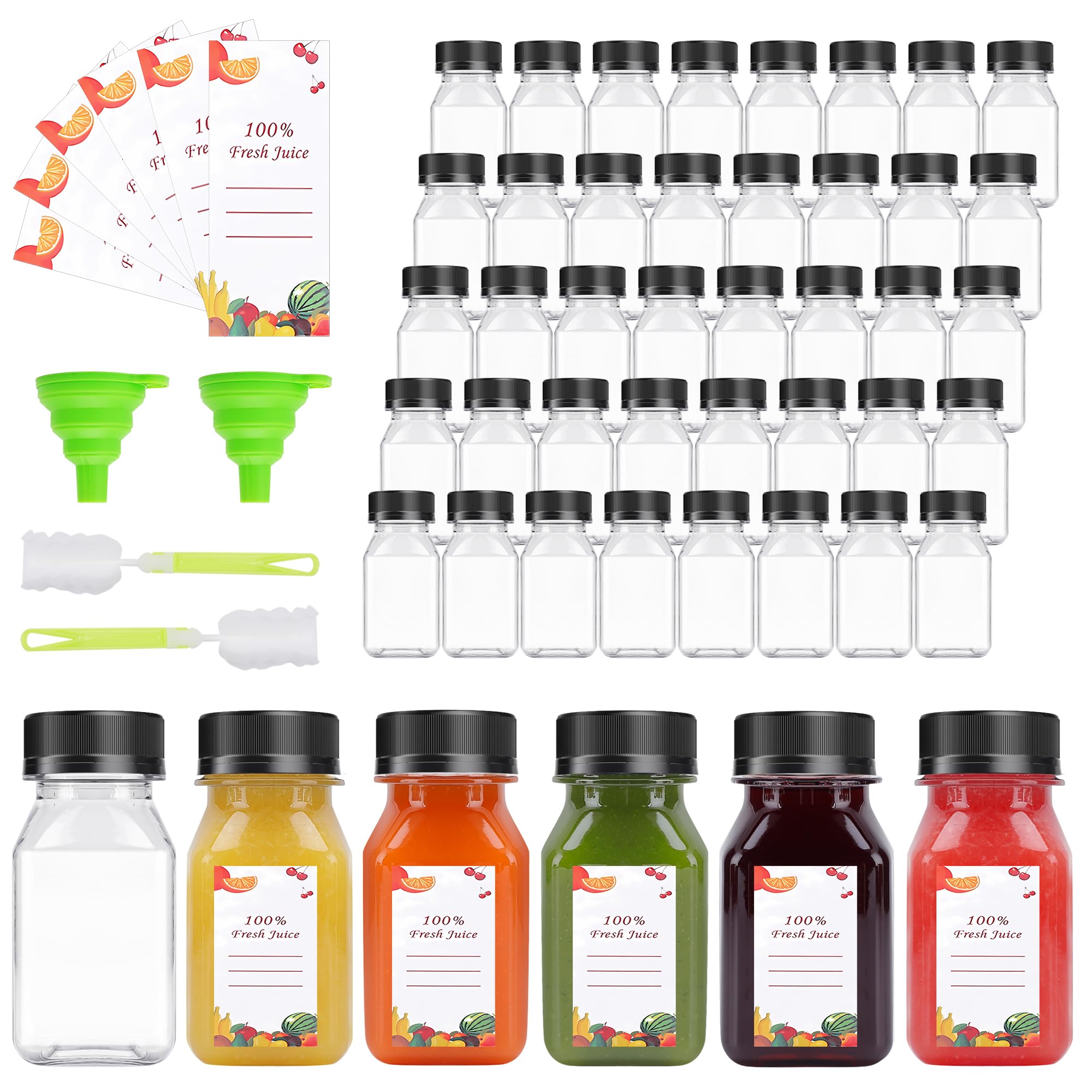 56 botellas de jugo de 4 onzas, botellas de jugo con tapas, botellas transparentes vacías reutilizables con etiqueta, embudo, cepi