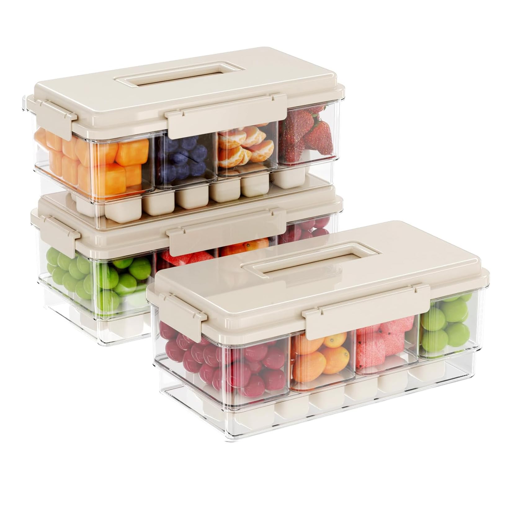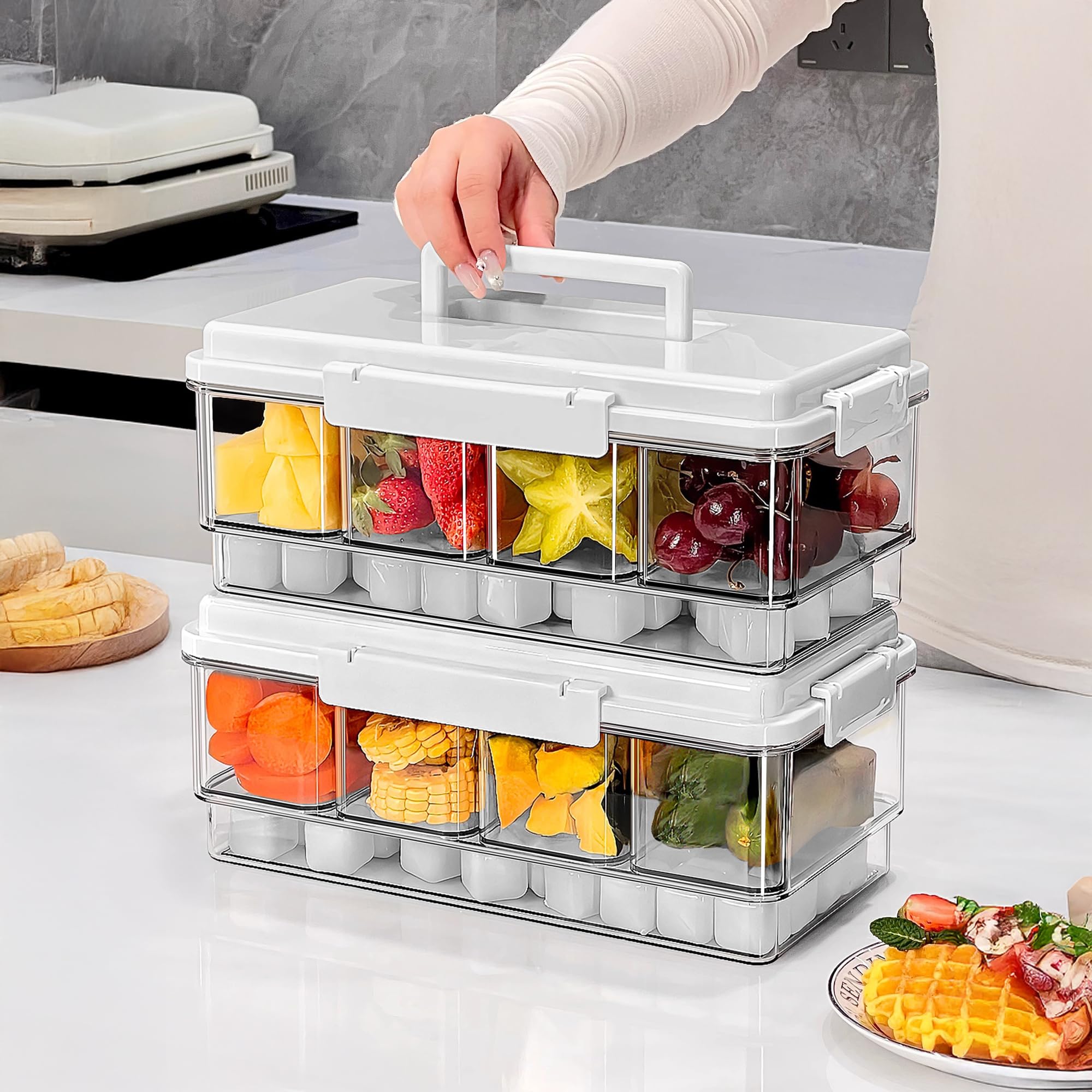 Paquete de 2 bandejas refrigeradas para condimentos con 4 recipientes, 4 tapas, bandeja para servir frutas con asa, caja organizad